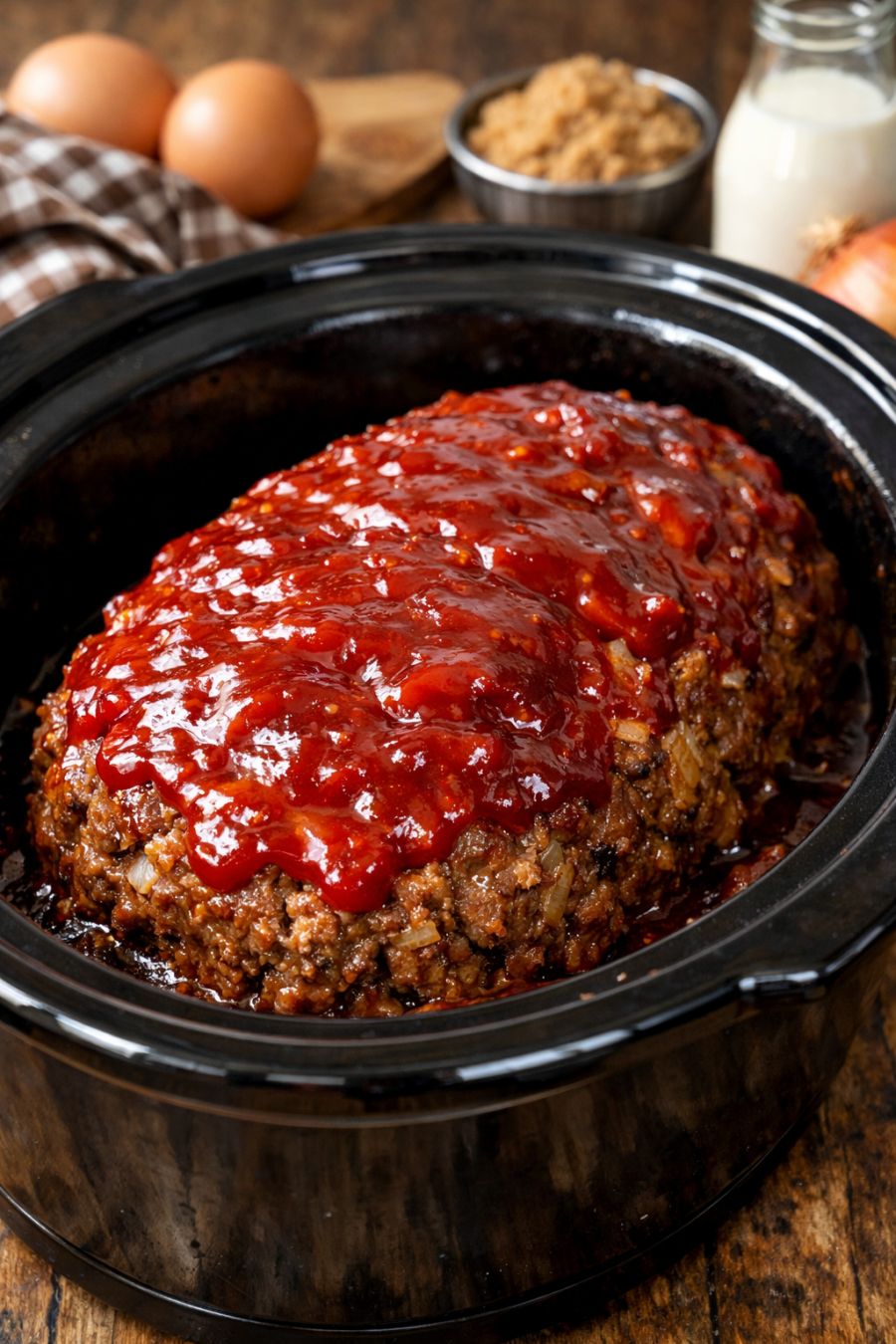 Serve this meatloaf in thick slices with buttery mashed potatoes or buttered egg noodles to catch the extra glaze. A simple side of green beans, peas, or a crisp lettuce salad balances the richness. Warm dinner rolls or crusty bread are perfect for swiping through any sauce left in the slow cooker, and if you like a bit of contrast, a spoonful of tangy coleslaw on the side works especially well.