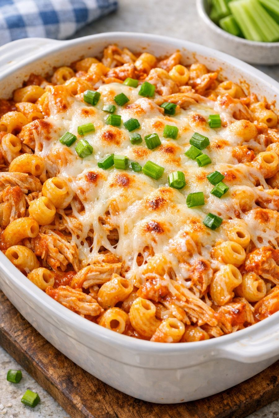 This oven-baked buffalo chicken pasta is one of those throw-it-all-in casseroles that makes weeknights feel a little easier and a lot more comforting. Everything happens right in one ceramic baking dish: you pour spicy buffalo sauce over raw dry elbow macaroni, add just four more simple ingredients, and let the oven do the work. The pasta soaks up the sauce, the chicken gets tender, and a cheesy, cozy bake comes out that tends to disappear faster than anything else on the table. It has that game-day buffalo wing flavor, but in a family-friendly pasta form that’s perfect for busy nights or casual get-togethers.