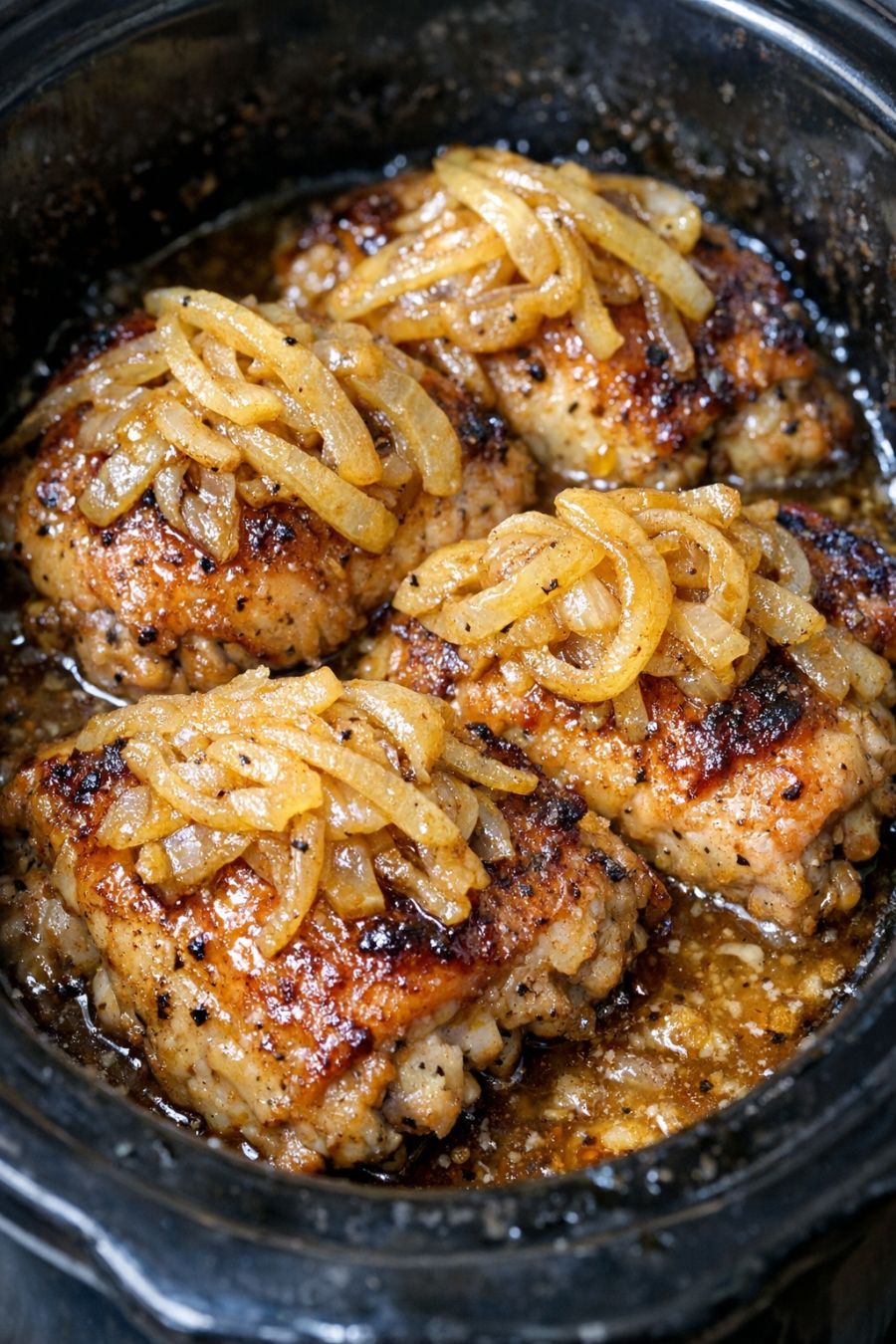 Use two forks to gently shred or chunk the chicken right in the slow cooker, or leave the thighs whole if you prefer. Stir to coat the chicken in the sweet onion sauce.