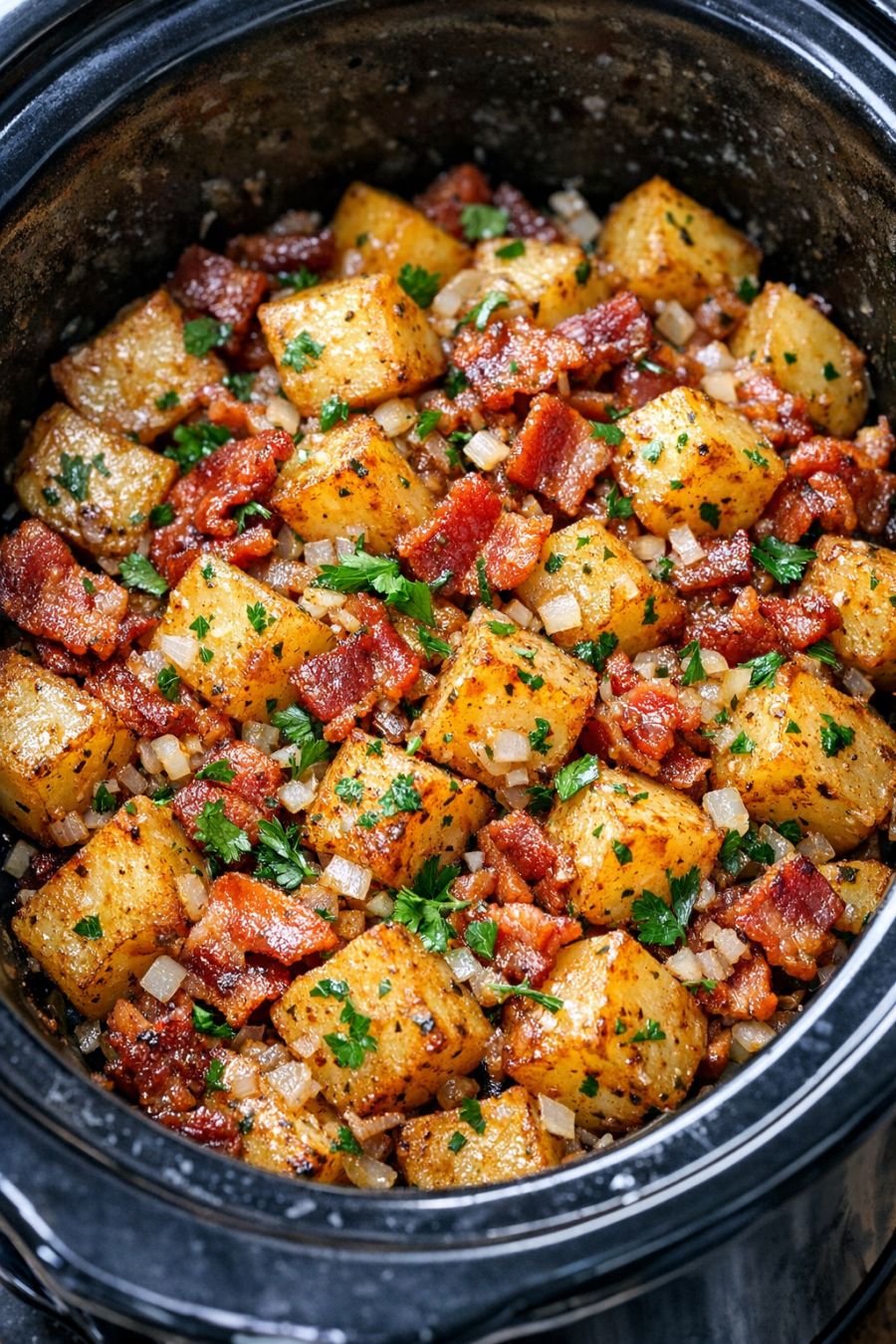 For a creamier version, stir in 1/2 to 3/4 cup sour cream or plain Greek yogurt right before serving to make the potatoes tangy and rich. If you like a little cheese, sprinkle 1 to 1 1/2 cups shredded cheddar or Colby Jack over the top during the last 10 to 15 minutes of cooking, then cover until melted. To boost the veggie factor, add 1 cup of frozen peas or corn during the last 30 minutes of cook time. For a slightly lighter take, use turkey bacon (just know it won’t render as much fat, so you may want to drizzle in 1 to 2 tablespoons of olive oil). You can also change up the flavor by adding 1 teaspoon of smoked paprika or garlic powder with the salt and pepper. To get a head start on busy mornings, dice the potatoes, onion, and bacon the night before and store them separately in the fridge; in the morning, layer them in the slow cooker, season, scatter the bacon over the top, and turn it on before you head out the door.