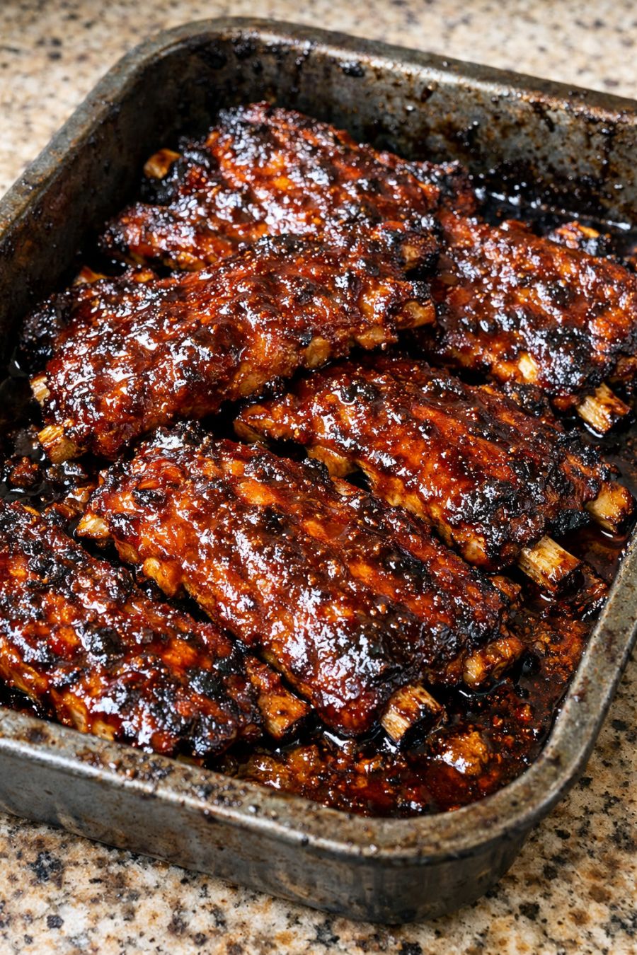 Let the ribs rest in the pan for about 10 minutes before serving so the juices settle and the sauce clings nicely. Spoon extra sauce from the pan over each serving.