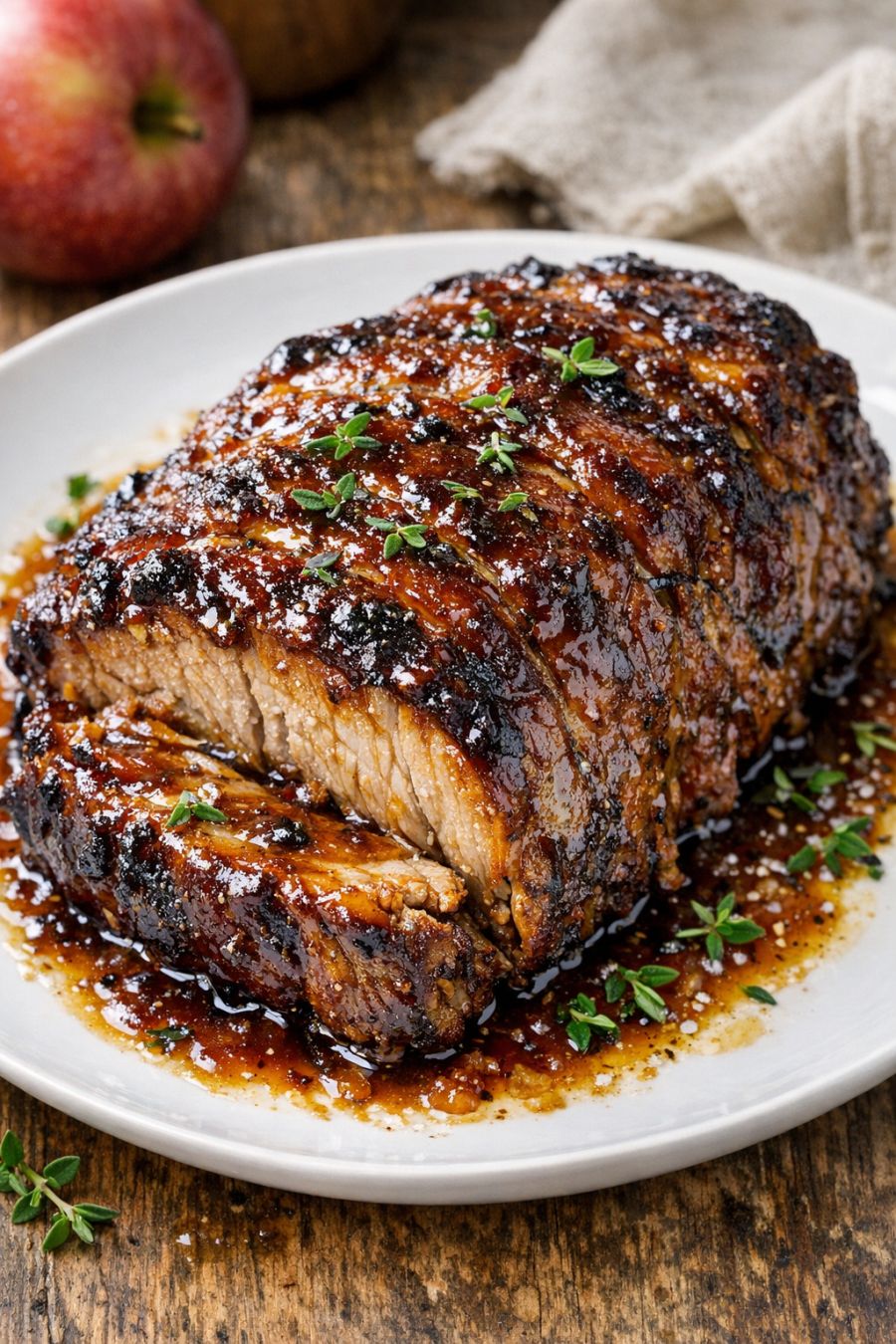 Serve the apple butter pork roast warm, spooning plenty of the sweet-savory pan juices over each portion.