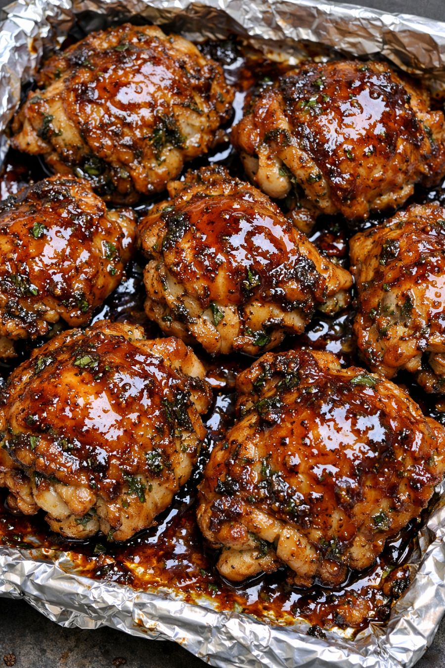 Sprinkle the brown sugar–Italian mixture evenly over the tops of the chicken thighs, pressing it gently so it sticks to the skin and forms a good coating. Any extra mixture can be patted onto the sides of the chicken or sprinkled around it on the foil.