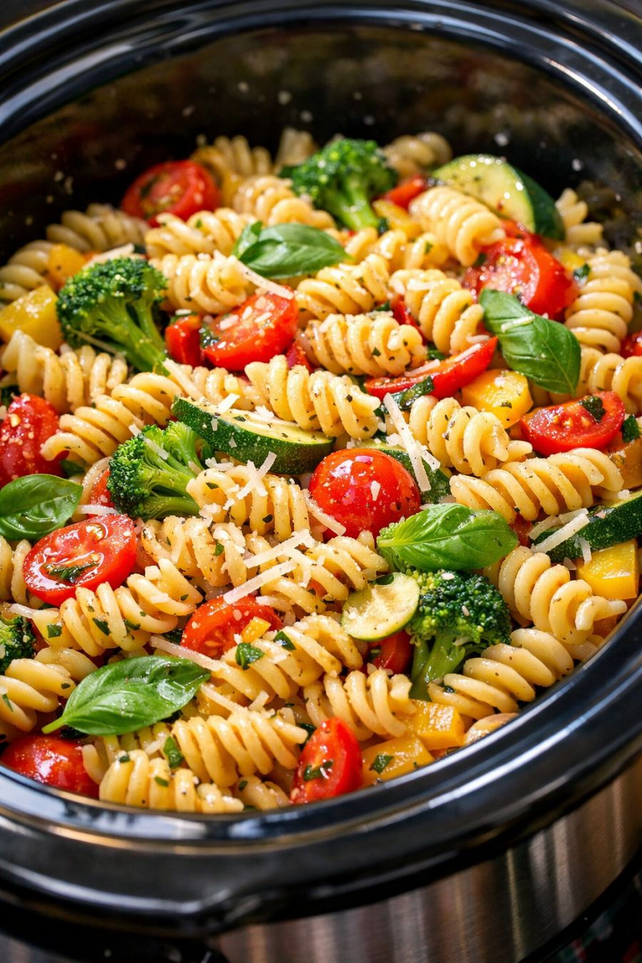 Once the pasta is cooked to your liking, quickly sprinkle the shredded Parmesan cheese over the top. Gently stir everything together, making sure the cheese melts into the warm pasta and sauce. If the mixture seems too thick, add a splash of extra broth or water to loosen it; if it’s too saucy, let it sit uncovered on WARM for 5 to 10 minutes to thicken.