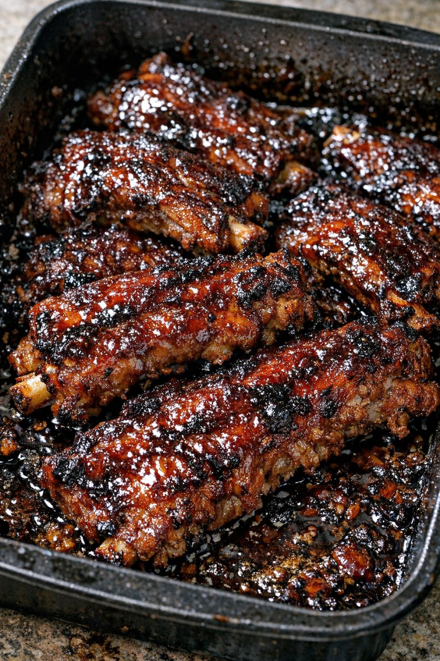 Let the ribs rest in the pan for about 10 minutes so the juices settle and the sauce clings nicely. Cut between the bones to separate the ribs, spoon more of the dark pan juices over the top, and serve hot straight from the roasting pan.