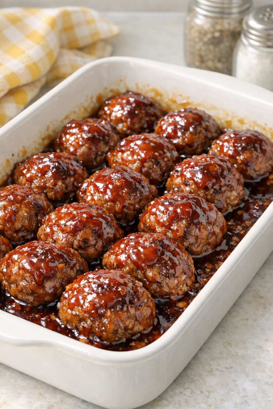Serve these saucy oven-baked meatballs over fluffy mashed potatoes, egg noodles, or steamed white rice so they can soak up every bit of that glossy, savory sauce. Add a simple green side like roasted broccoli, green beans, or a tossed salad to round out the meal. If you’re feeding a crowd or want a game-day snack, spear the meatballs with toothpicks and offer them straight from the pan as a hearty appetizer alongside crusty bread for dipping.