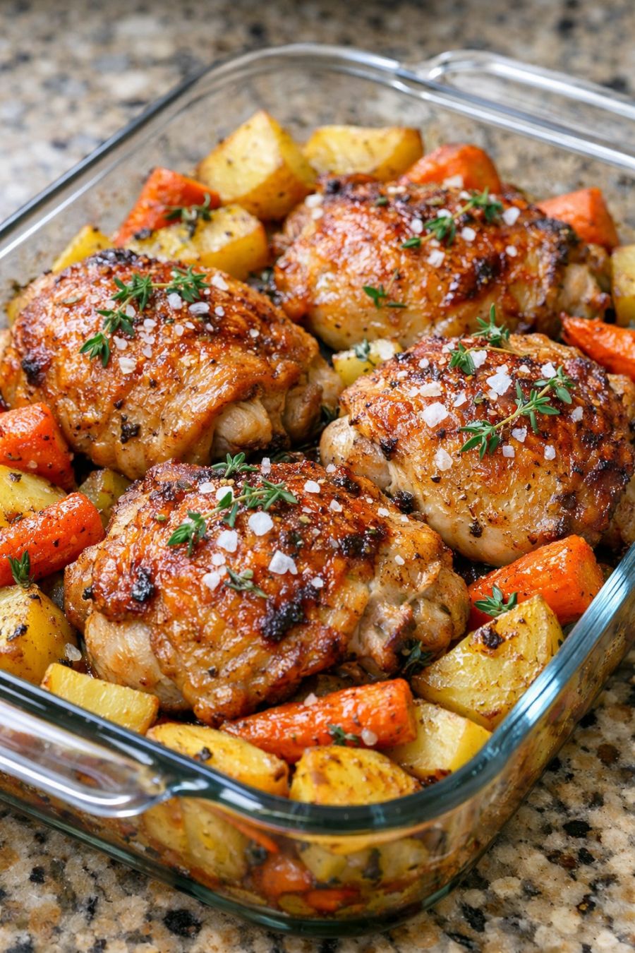 Slide the glass casserole dish into the preheated oven and bake, uncovered, for 45 to 55 minutes, or until the chicken skin is golden, the juices run clear, and an instant-read thermometer inserted into the thickest part of a thigh (not touching bone) reads 165°F (74°C). The vegetables should be tender and starting to caramelize around the edges.
