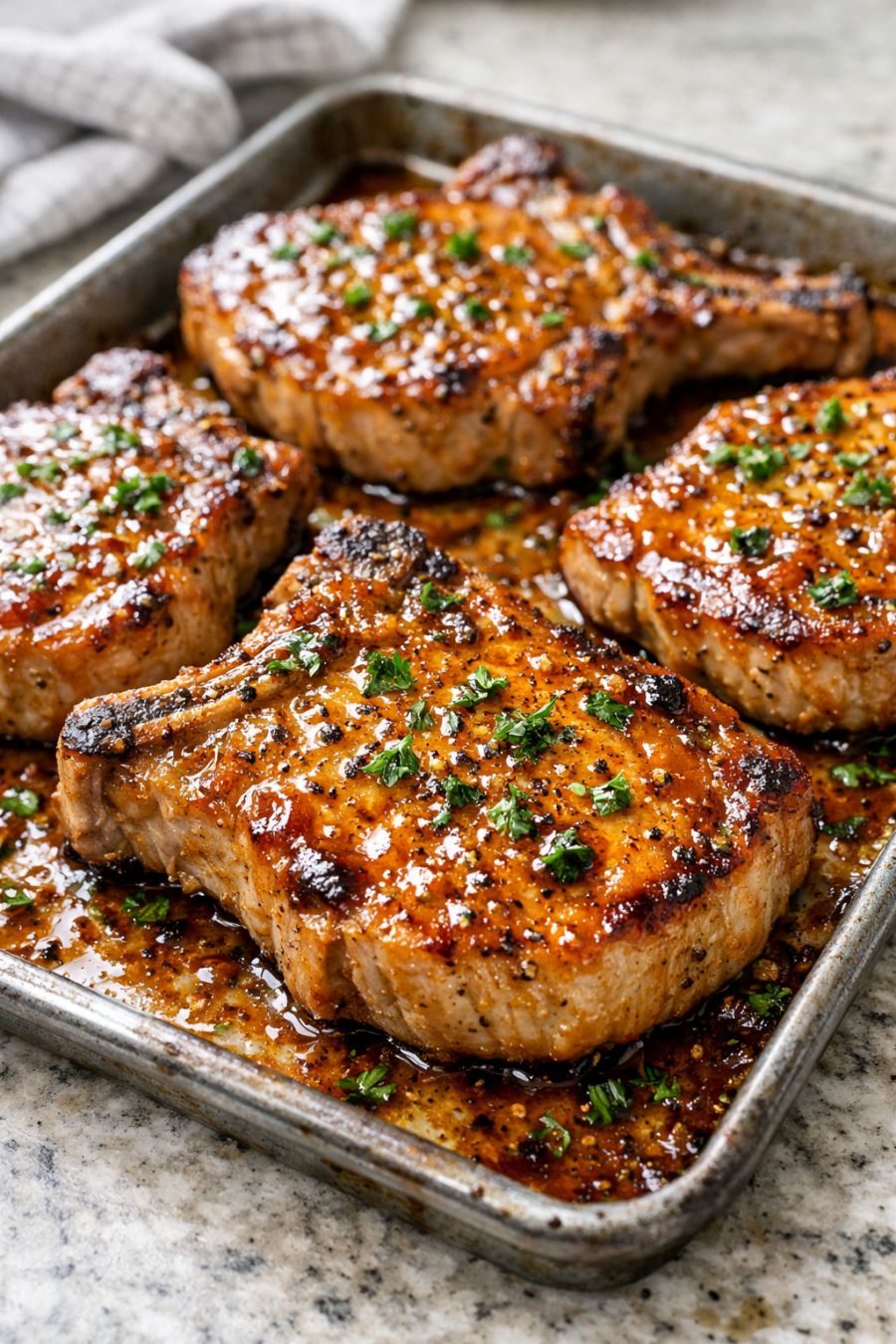 Remove the baking sheet from the oven and let the pork chops rest on the pan for 5 minutes. This helps the juices settle so the meat stays tender and moist.