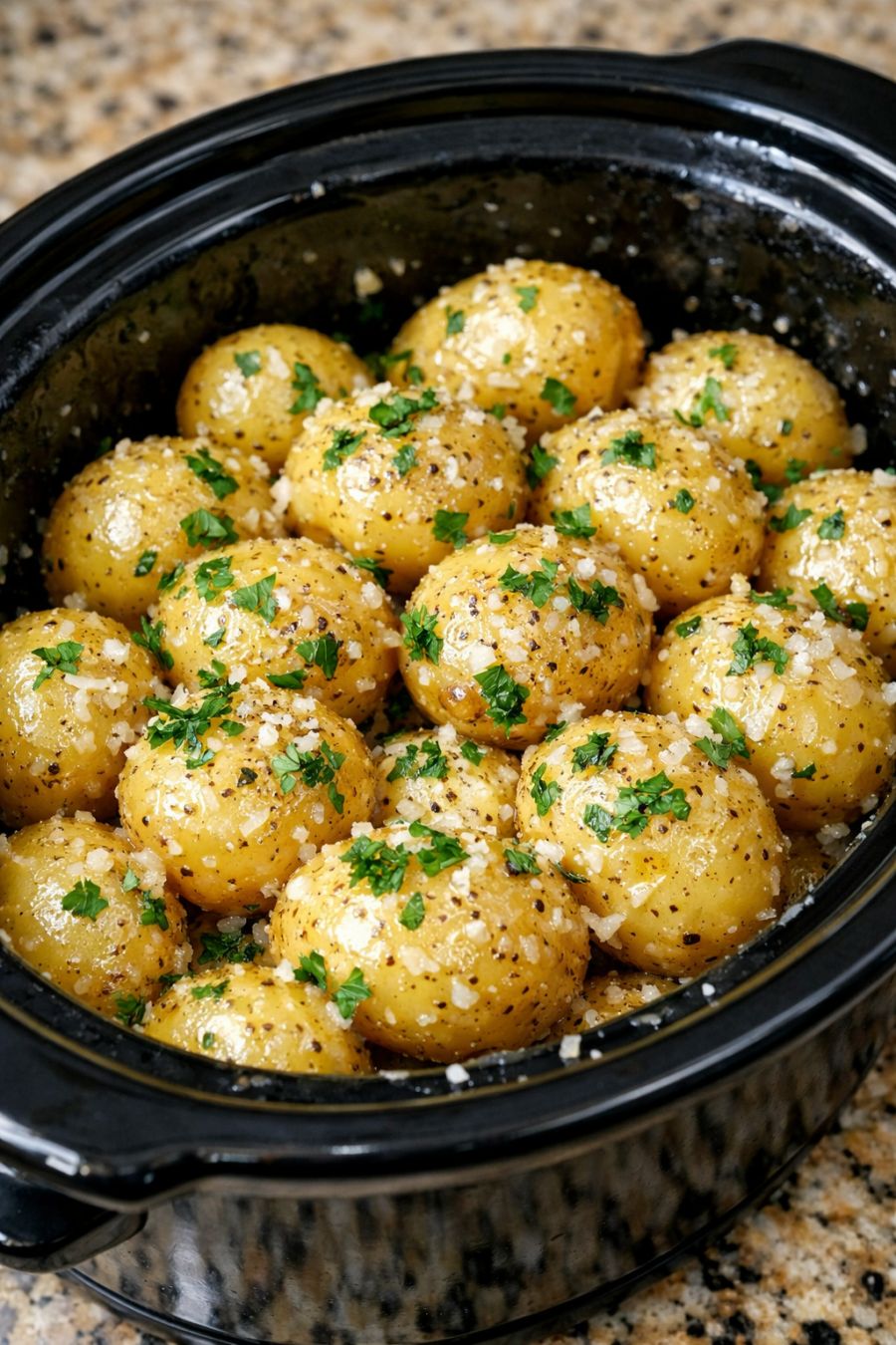 For serving at a potluck, you can either serve the potatoes directly from the slow cooker or transfer them to a warm serving dish, spooning some of the buttery sauce over the top and finishing with a light shower of additional Parmesan if desired.