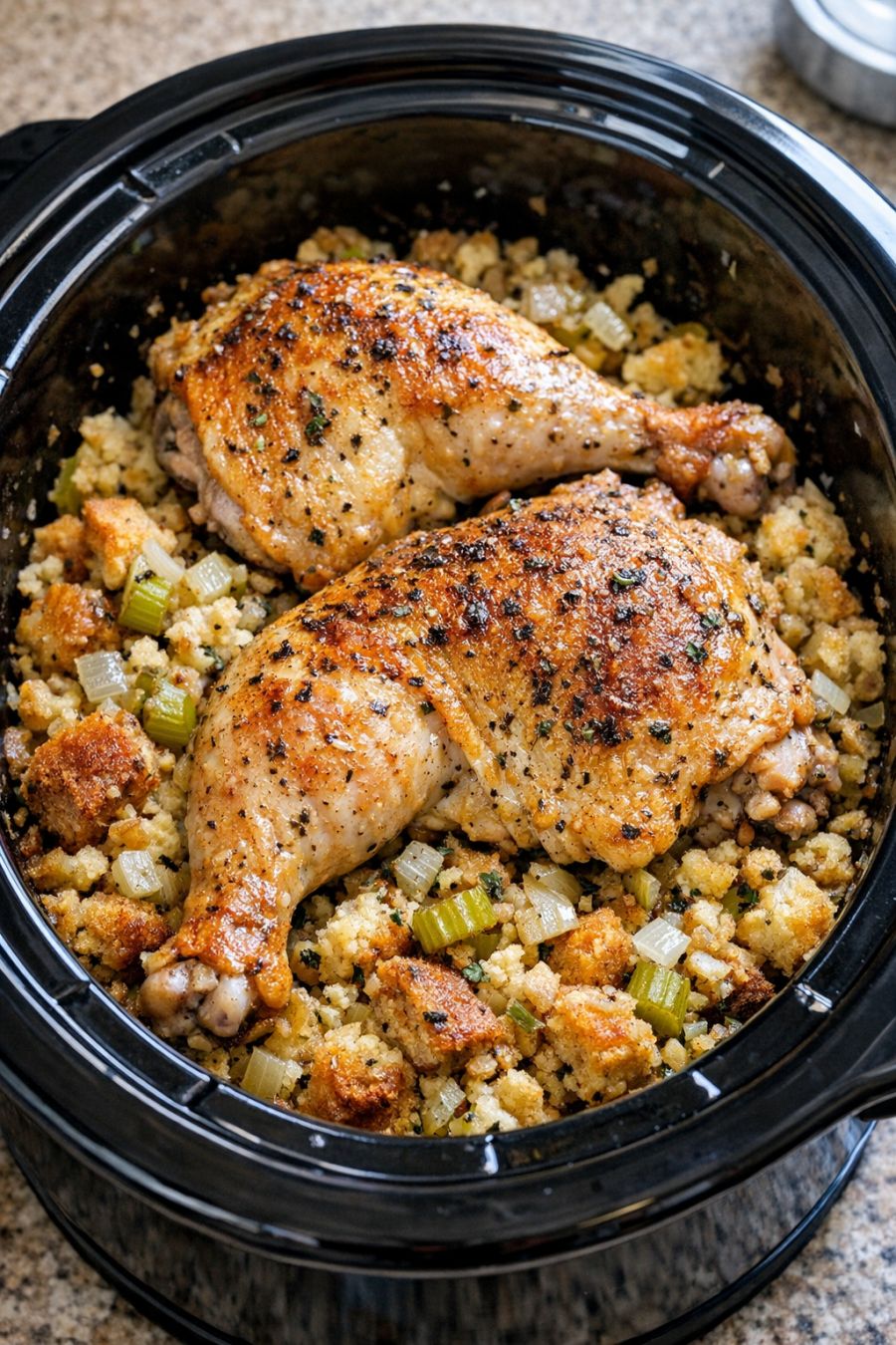 Use a large spoon to scoop the bread stuffing from the bottom of the slow cooker onto plates, then top each portion with a chicken quarter. Spoon any remaining juices from the cooker over the stuffing for extra flavor, and serve warm.