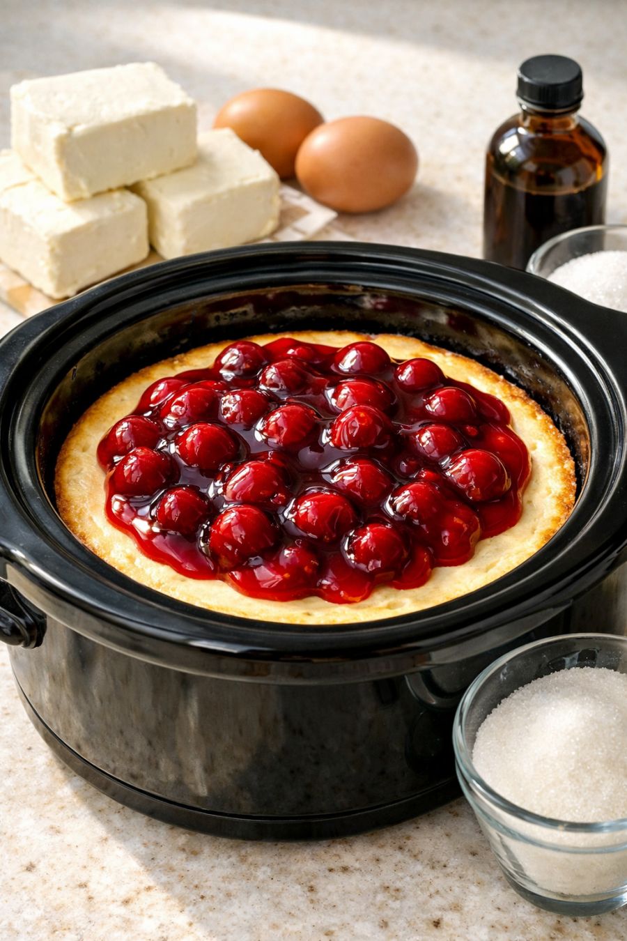 Serve this cheesecake chilled, scooped or sliced right out of the slow cooker crock. It’s lovely plain, but a spoonful of cherry pie filling, fresh berries, or a drizzle of caramel sauce makes it company-ready in seconds. A little dollop of whipped cream never hurt, either. Pair it with hot coffee after Sunday dinner or a glass of cold milk for the grandkids. It also travels well—just pop the cooled crock into the fridge overnight, then bring it along to potlucks and slice once you arrive.