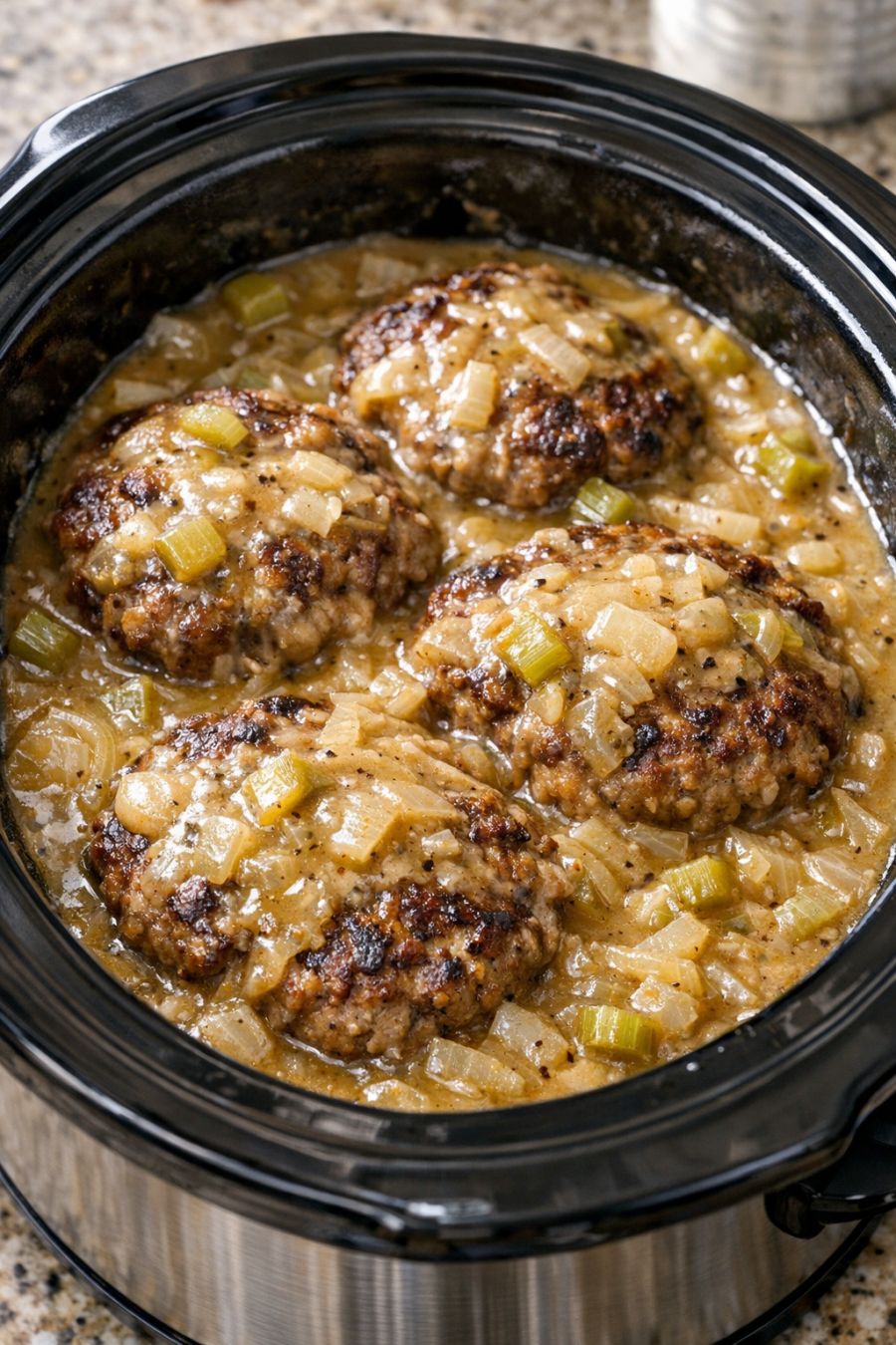 If you like a little extra richness, you can replace the water with beef broth for a deeper flavor, or stir in a tablespoon of Worcestershire sauce with the soup mixture. For a creamier gravy, add 1/4 cup of sour cream at the very end of cooking, stirring it into the sauce after you remove the patties. You can also nestle a few thick-sliced onions or mushrooms under and around the raw patties before spooning on the soup mixture; they’ll cook down into the gravy and give it more body. If you’re cooking for two, halve the recipe and use a smaller slow cooker so the patties still sit in a single layer. For leaner eating, you can use 90% lean ground beef or even ground turkey, but keep an eye on the cooking time so they don’t dry out—turkey especially benefits from the lower, slower setting. If the gravy seems too thin at the end, remove the lid and let it cook on HIGH for 15 minutes, or stir in a slurry of 1 teaspoon cornstarch mixed with 1 tablespoon cold water and cook until thickened.