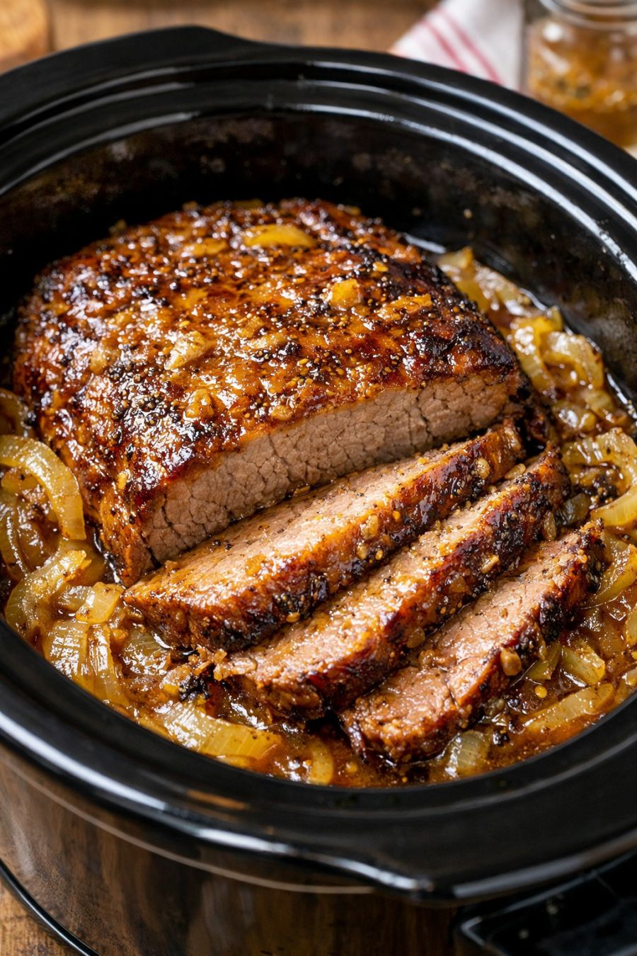 Scatter the sliced onion around and under the brisket as best you can. It doesn’t need to be perfect—just tuck some under the edges and leave the rest alongside the meat in the bottom of the slow cooker.
