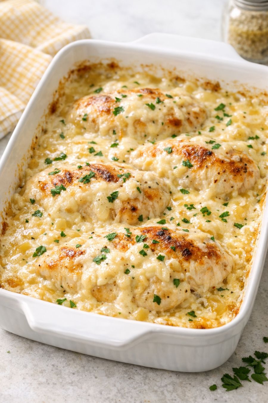 Let the chicken rest in the hot dish for about 5 minutes so the juices settle and the sauce thickens slightly. Serve each chicken breast with a generous spoonful of the creamy sauce from the casserole dish.