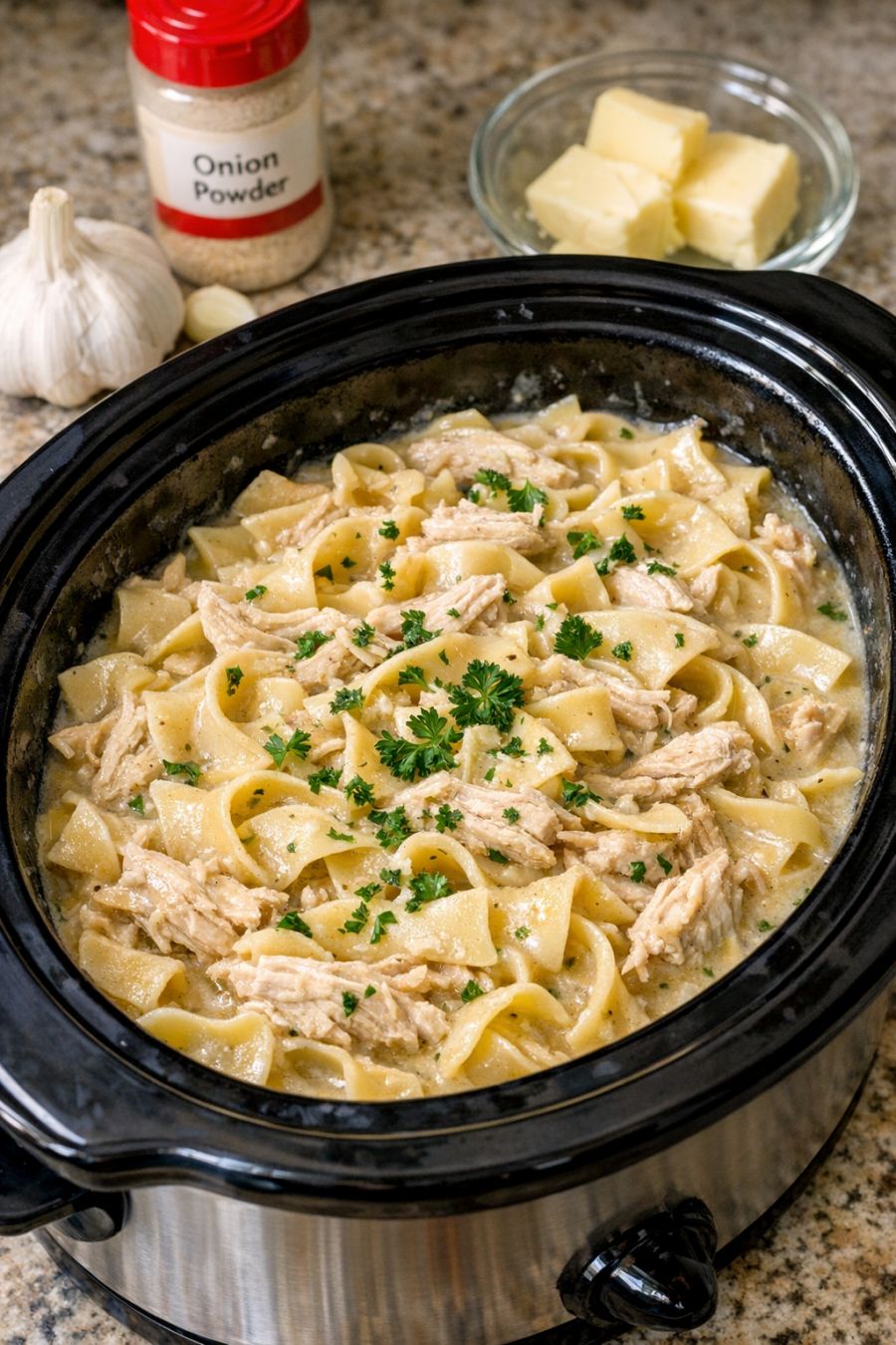 Cover the slow cooker with the lid and cook on LOW for 5–6 hours, or on HIGH for about 3 hours, until the chicken is cooked through and the noodles are tender. Avoid lifting the lid too often so the noodles can steam and soften properly.