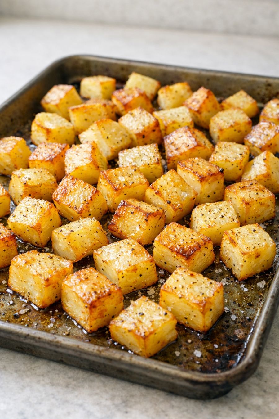 Sprinkle the salt and black pepper evenly over the potatoes. Give them one more quick toss or shimmy with the spatula so the seasoning is distributed and the cubes are spread back out into a single layer.