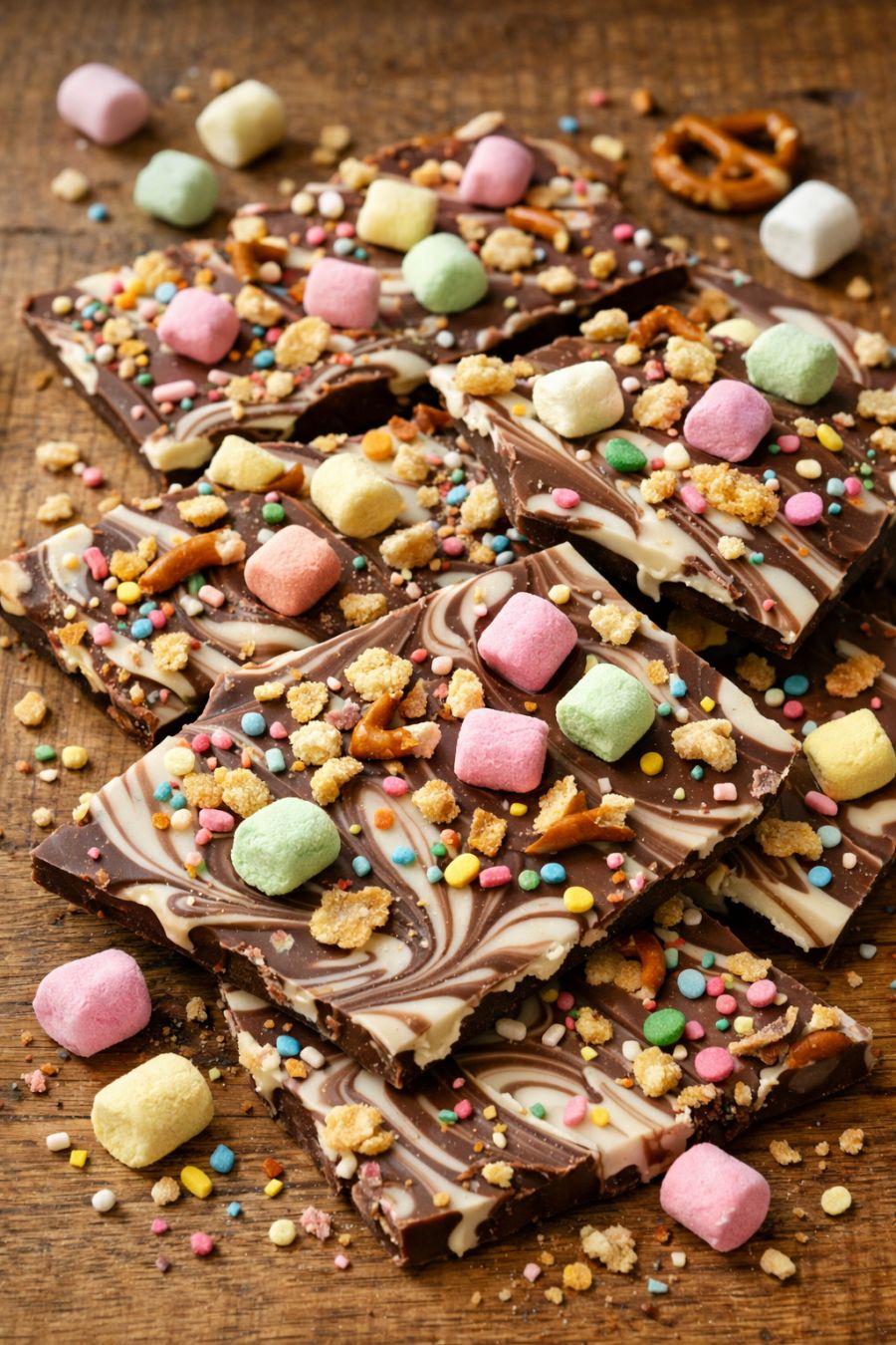 For a sweeter, creamier bark, swap the semi-sweet chocolate chips for milk chocolate chips, or use all white chocolate for a very pastel, visually soft result. Add a festive crunch by replacing some or all of the pretzels with crushed vanilla wafers, graham crackers, or cornflakes. If your grandkids love peanut butter, drizzle 1/4 cup of warmed peanut butter over the top before sprinkling the pretzels, then lightly swirl it in. To make it even more colorful, scatter a small handful of pastel candy-coated chocolates or sprinkles over the surface right after spreading the mixture in the pan so they adhere before it sets. For a slightly less sweet version, increase the pretzels to 3/4 cup and use dark chocolate chips. If you’re in a warm kitchen and the mixture seems too loose, simply spread it a bit thinner and chill longer; conversely, if it sets too firmly, let the bark sit at room temperature for 10–15 minutes before breaking into pieces so it’s easier to handle.