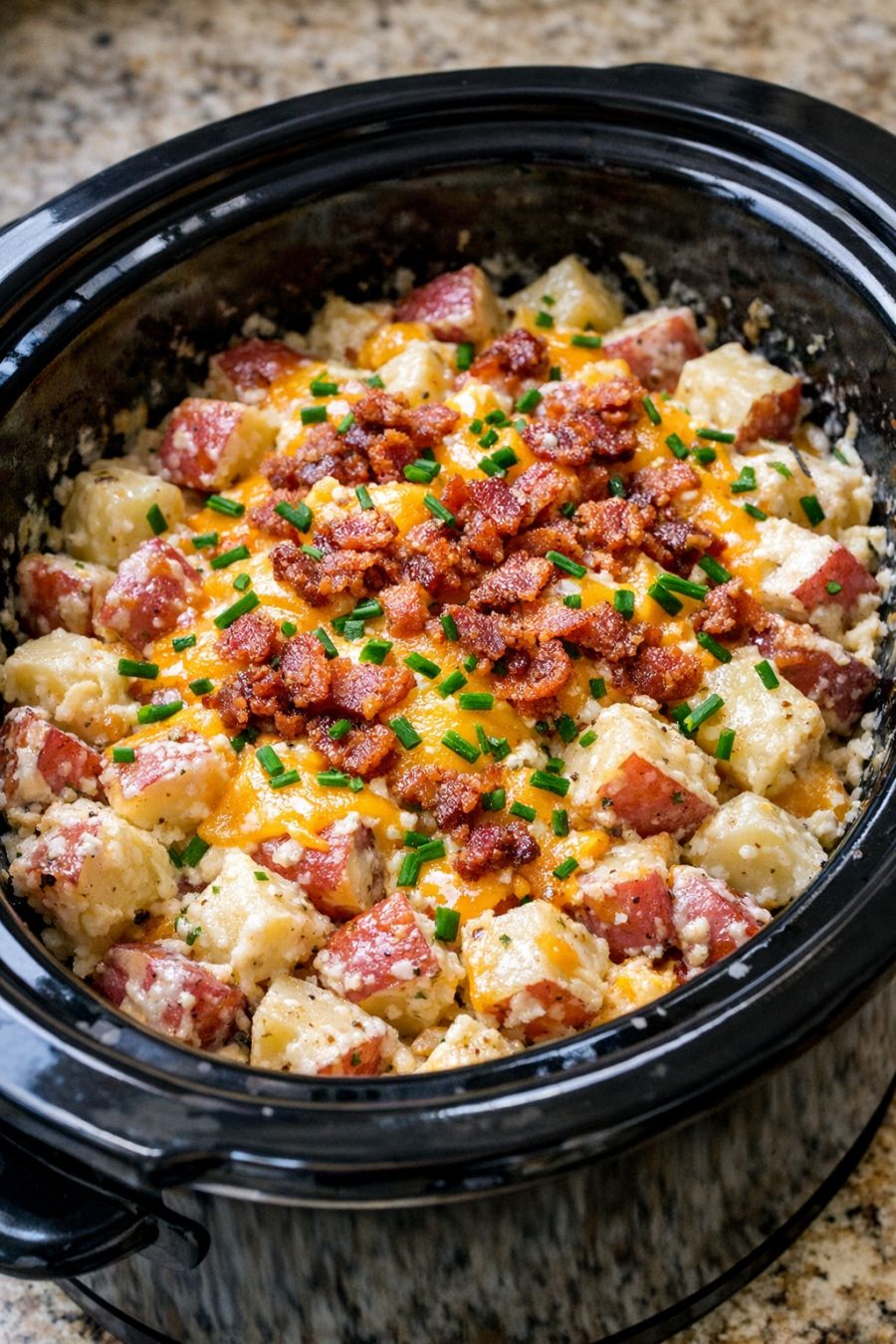 Cover the slow cooker with the lid and cook on HIGH for 3 to 3 1/2 hours or on LOW for 5 to 6 hours, until the potatoes are very tender when pierced with a fork and the mixture is bubbly and creamy.