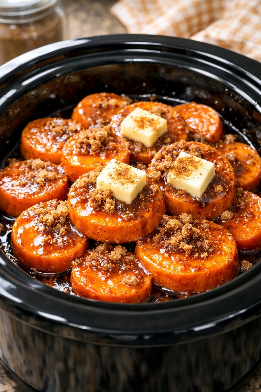 Gently baste with glaze: Once the sweet potatoes are tender, carefully spoon some of the brown sugar butter glaze from the bottom of the slow cooker over the top of the coins. This gives them that shiny, caramelized look and extra sweetness kids love.