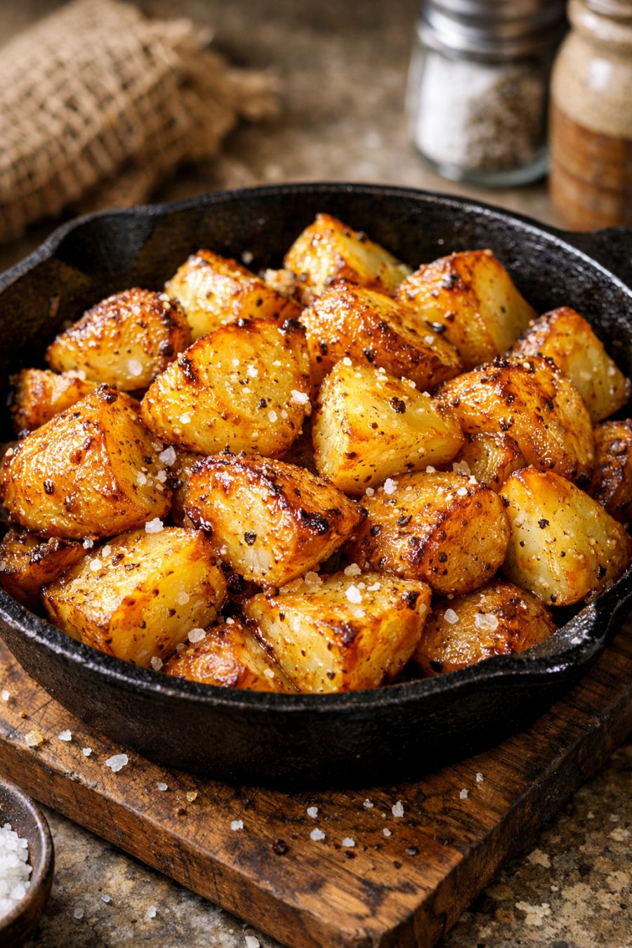 If you’d like to keep the ingredient list simple but add a little nuance, you can play with the cut and the salt. Cut the potatoes into wedges instead of chunks for a steakhouse feel, or go smaller for extra-crispy, almost hash-style potatoes. Use a coarse sea salt for a more pronounced crunch or a smoked salt for a subtle campfire note. To stay true to the three-ingredient spirit but layer in aroma, you can warm a clove of smashed garlic or a sprig of rosemary in the lard as it melts, then remove and discard them before pouring the lard over the potatoes; the flavor will be gentle but present without technically adding another ingredient to the pan. For a make-ahead head start, you can parboil the potato chunks in salted water for 5–7 minutes, drain very well, rough up the edges in the colander, and then proceed with the hot-skillet and melted-lard method; this gives an even fluffier interior and extra-craggy exterior. If you don’t have a cast iron skillet, use a heavy metal baking sheet that can preheat in the oven—just be sure to pour the melted lard over the potatoes directly on the hot pan to mimic that sizzling contact you’d get from cast iron.