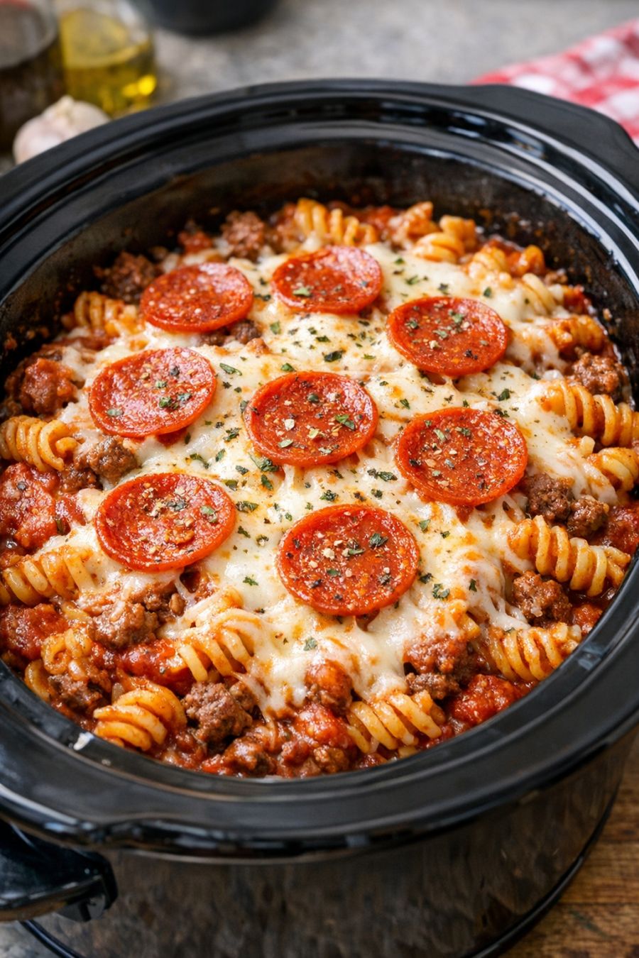 For picky eaters, keep the base recipe as-is and put optional toppings on the side: sliced black olives, diced green peppers, mini pepperoni, or red pepper flakes can all be sprinkled on individual servings so everyone gets their own version of “pizza.” If you want more of a supreme pizza feel and have room in the budget, sauté a small chopped onion and a bell pepper with the ground beef, or stir in a handful of sliced mushrooms before adding the sauce. To stretch the meat further, use only 1/2 pound of ground beef and add an extra 1/2 cup of sauce plus a handful of cooked lentils or finely chopped mushrooms; the texture stays hearty but costs less. You can also swap the ground beef for whatever is on sale—ground turkey, pork, or a mix will all work. For a cheesier bake, add 1/2 cup of grated Parmesan or a handful of cheddar with the top layer of mozzarella. If you need to make it ahead, assemble everything in the slow cooker insert, cover, and refrigerate up to 12 hours, then place the cold insert into the slow cooker, add 30–45 minutes to the cook time, and proceed as directed. And if your crew likes a bit of crunch, top each bowl with crushed crackers or garlic croutons right before serving to mimic that crispy pizza crust feeling without any extra work.