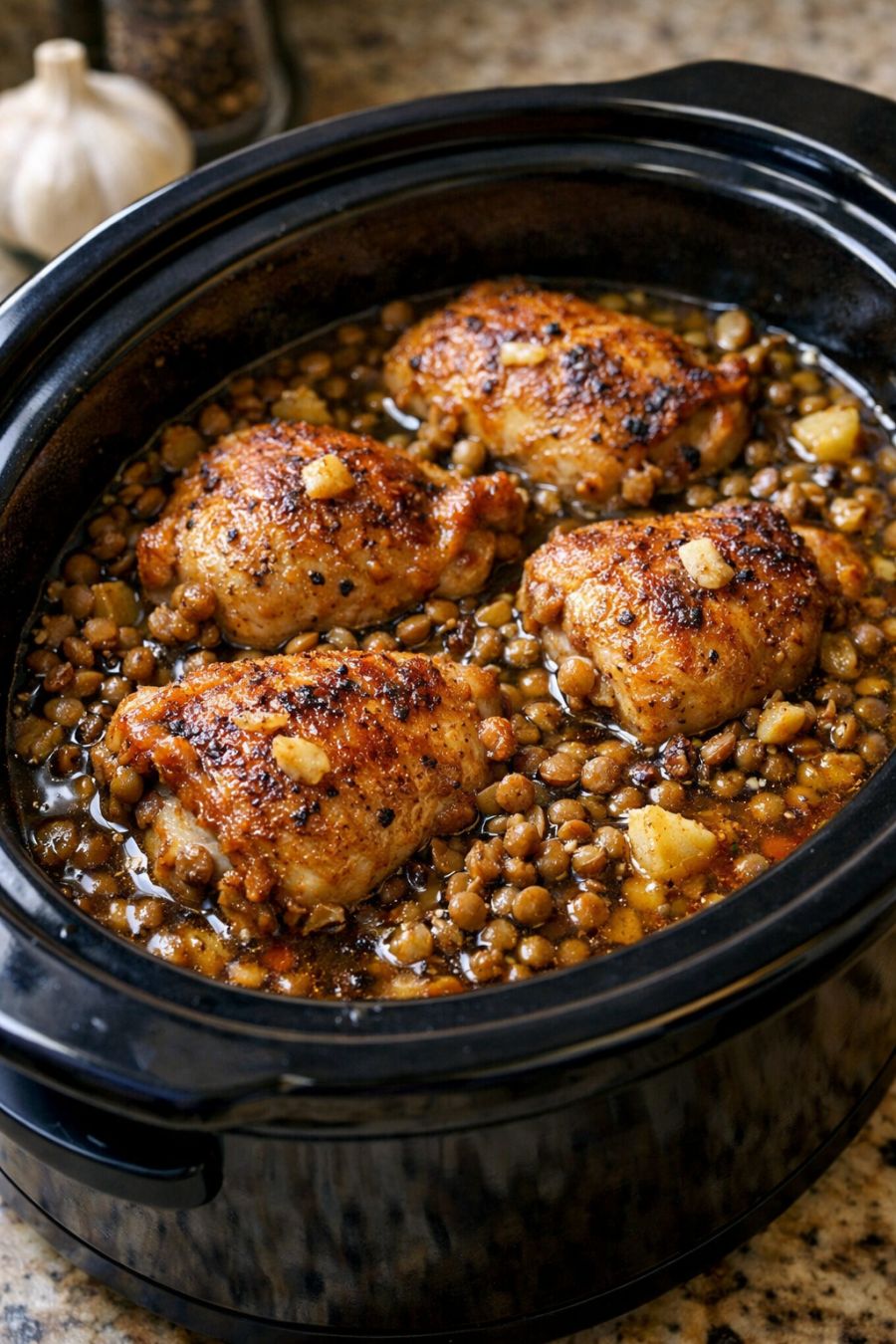 Cover the slow cooker with the lid and cook on LOW for 6 to 8 hours, or on HIGH for 3 1/2 to 4 hours, until the lentils are tender and the chicken is very soft and cooked through (an instant-read thermometer in the thickest part of a thigh should read at least 165°F).
