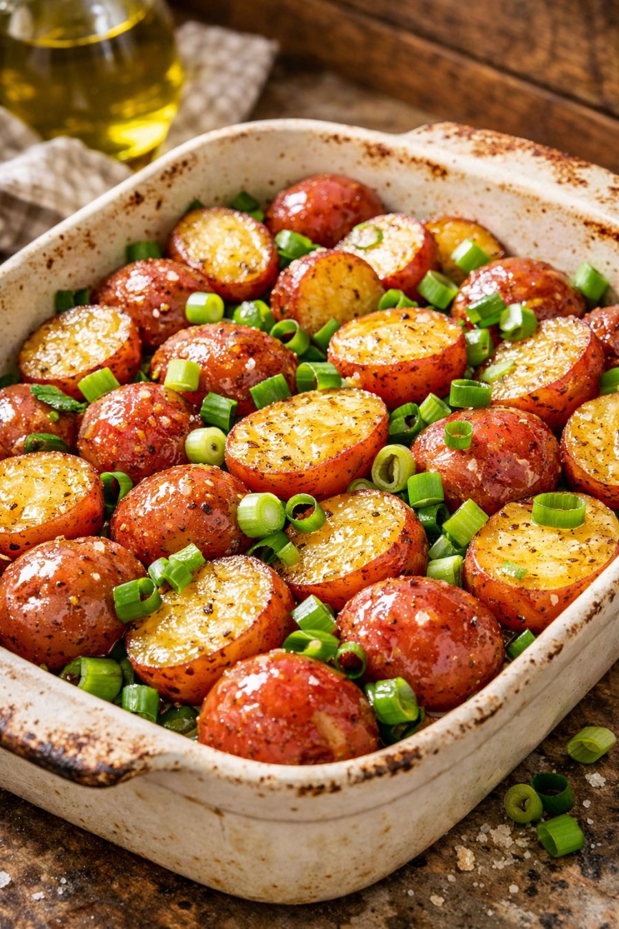 This little pan of Amish-style spring onion potatoes is the kind of simple, honest food I grew up with out here in the rural Midwest. It’s just four ingredients and a ceramic baking dish, the way the older farm wives liked to cook—nothing fancy, just what was on hand. You scatter sliced spring onions over raw halved baby red potatoes, add two more pantry staples, and let the oven do the rest. The kitchen fills with that cozy, oniony-roasty smell that always reminds me of church potlucks in March and April, when the first green onions poked up by the fence line. It’s the sort of side dish that quietly steals the show and disappears before anything else on the table.
