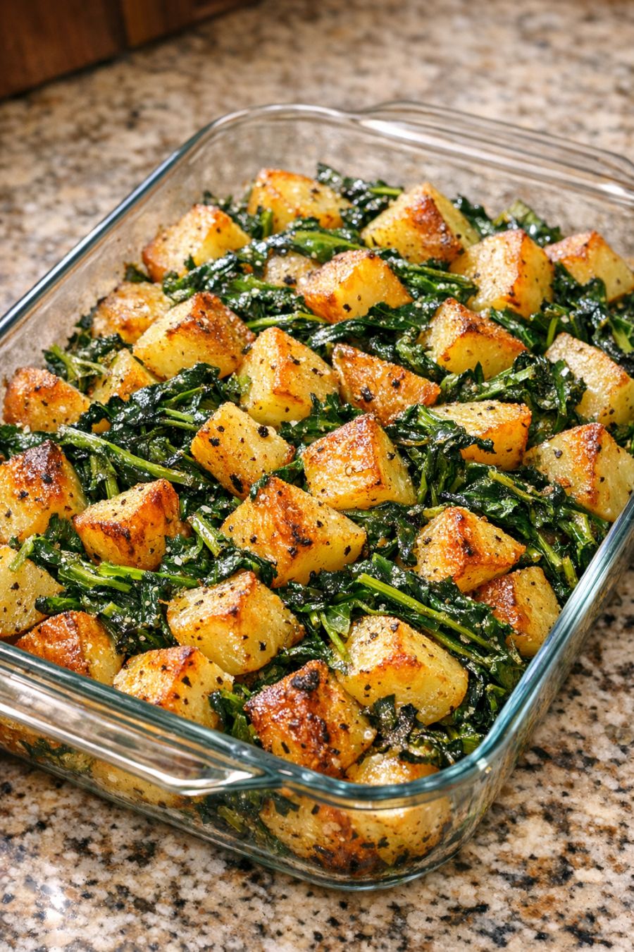 If your family is unsure about dandelion greens, you can start with half dandelion greens and half mild greens like baby spinach or chopped Swiss chard, then increase the dandelion as they get used to the flavor. For picky eaters, dice the potatoes a little smaller so the greens cling to them and are less obvious in each bite. You can also add a small sprinkle of black pepper or garlic powder before baking without changing the spirit of the recipe. For a richer version, drizzle a tablespoon or two of cream over the potatoes during the last 10 minutes of baking or add a small handful of shredded mild cheese on top. If you don’t have Yukon Gold potatoes, red potatoes work well and hold their shape nicely. To prep ahead, you can dice the potatoes and chop the greens earlier in the day; keep the potatoes covered in cold water in the fridge so they don’t brown, then drain and pat dry before scattering them into the glass pan with the greens and baking as directed.