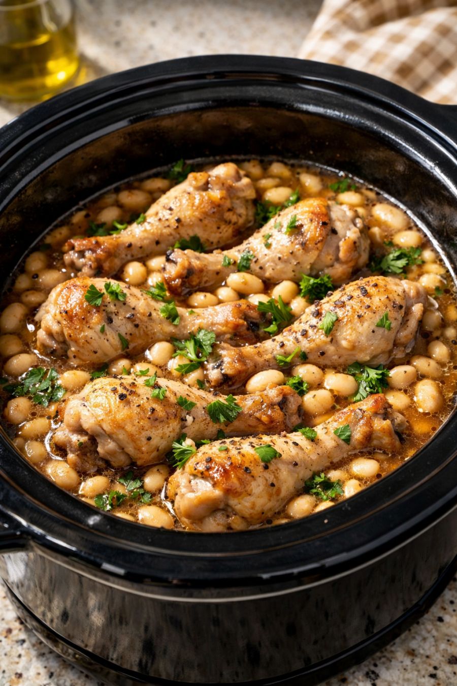 Scatter the rinsed dried navy beans all around and in between the chicken drumsticks in the slow cooker, so the beans form an even layer around the meat. This is the key step—the beans will cook in the same space and juices as the chicken.