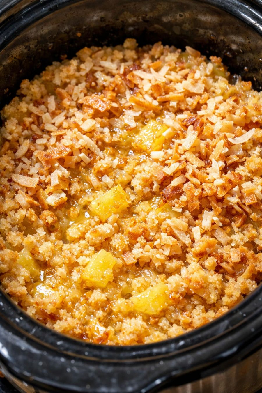 Serve this sunshine dessert warm, straight from the slow cooker, scooped into bowls. It’s amazing on its own, but a scoop of vanilla ice cream or a dollop of whipped cream makes it extra special. If you want a little texture, sprinkle toasted coconut or chopped pecans on top right before serving. For an easy weeknight treat, pair it with coffee or hot tea; for a more special occasion, serve it after a light dinner like grilled chicken and a simple salad so there’s plenty of room for dessert.