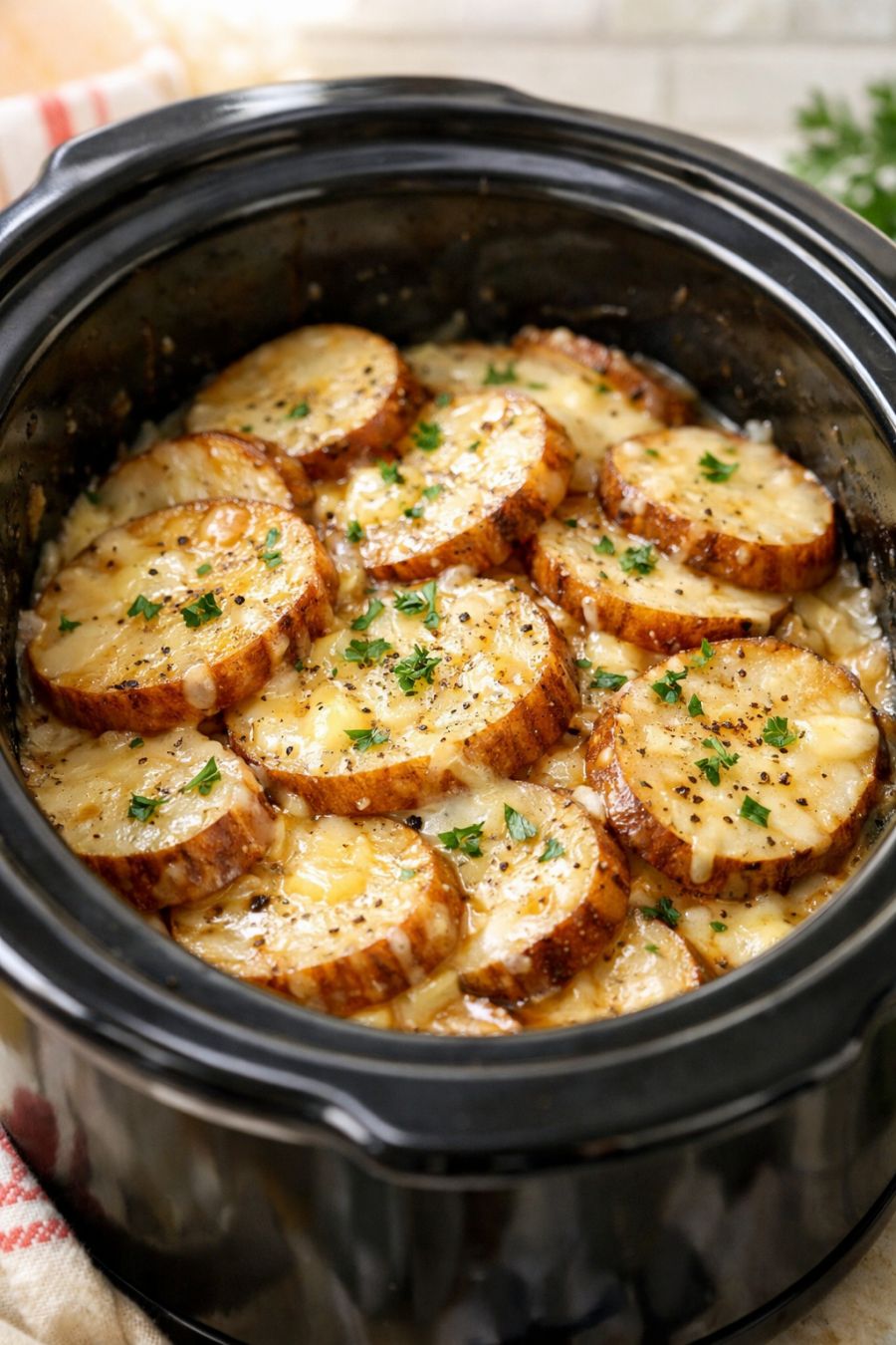 Turn the slow cooker to WARM and let the potatoes sit, covered, for 10 to 15 minutes before serving to allow the sauce to thicken slightly and cling to the potatoes. Serve straight from the slow cooker for an easy, family-style presentation.