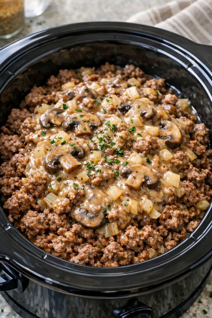 For a creamier, richer sauce, stir in 2 to 4 tablespoons of sour cream at the very end of cooking, just before serving. If your family prefers a little extra gravy, add up to 1/2 cup more water or a splash of beef broth along with the soup mixture at the start. You can also tuck in 1 to 2 cups of sliced mushrooms or a handful of frozen peas during the last hour of cooking for a bit of color and texture. For a slightly lighter version, you can use 90% lean ground beef and the “healthy” or low-sodium style of cream soup, then season to taste once it’s done. Leftovers reheat nicely in a skillet with a splash of water and make wonderful open-faced sandwiches on toast or buns with a slice of cheese melted over the top.