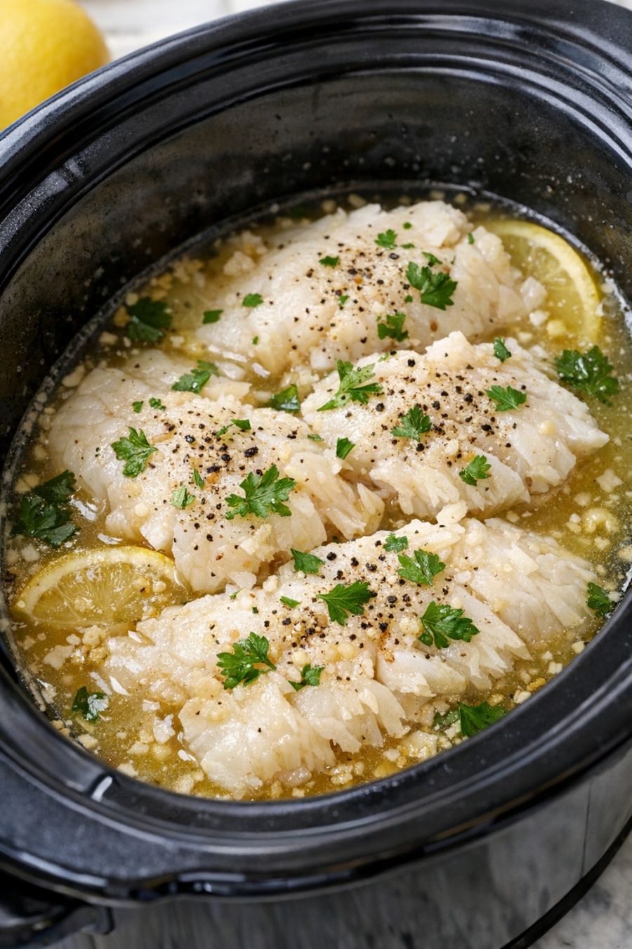 Use a wide spatula to gently lift the fillets out of the slow cooker and transfer them to plates or a serving platter. Spoon some of the lemony broth over the top of each portion.