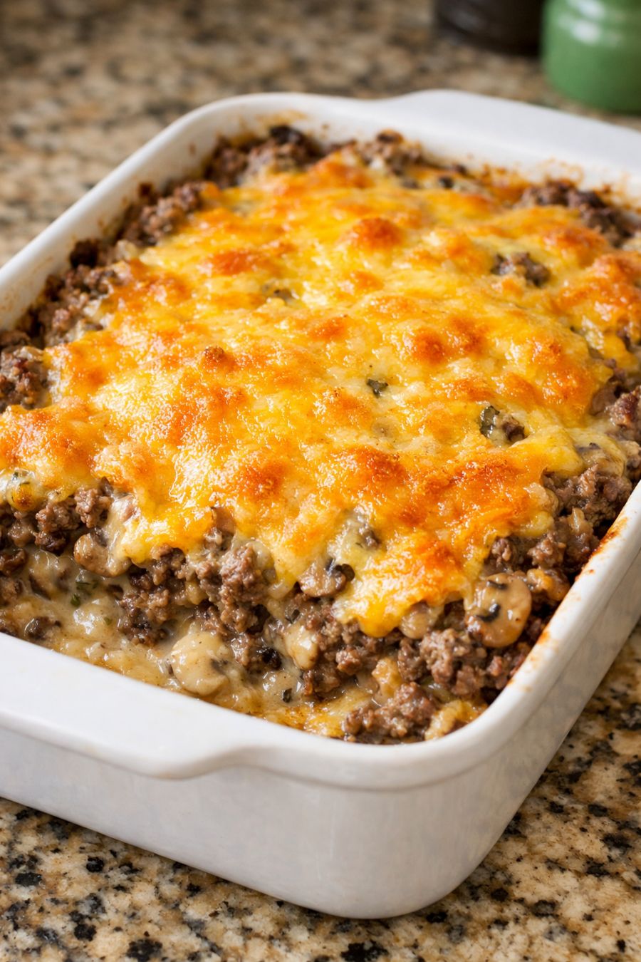 For picky eaters, you can swap cream of mushroom soup for cream of chicken or cream of celery if they don’t like mushroom pieces. If onions are a hard no, replace the dry onion soup mix with 1 teaspoon garlic powder, 1 teaspoon dried parsley, and 1/2 teaspoon salt for a milder flavor. For a slightly lighter version, use light sour cream and leaner ground beef, and drain off any excess fat after the first 30 minutes before stirring and adding cheese. To stretch this meal for a bigger family, stir in 1–2 cups of cooked egg noodles, cooked rice, or frozen mixed vegetables (like peas and carrots) after the first bake, then top with cheese and finish baking. For extra crunch, add 1/2–1 cup of crushed butter crackers or French-fried onions on top of the cheese before the final bake. If you like a bit of zip, mix in 1/4 cup salsa or a pinch of red pepper flakes into the creamy mixture. This recipe also reheats well, so you can double it and bake in two smaller dishes—serve one tonight and cool, cover, and refrigerate the other for an easy reheat later in the week.