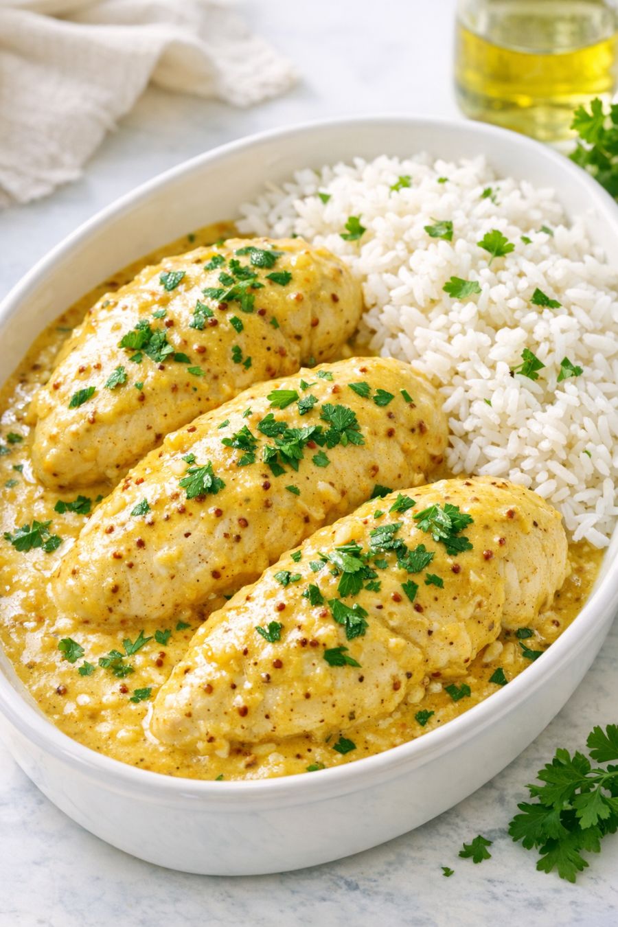If you like a little sweetness with your mustard, stir 1–2 tablespoons of brown sugar or honey into the soup and broth mixture before pouring it over the chicken. For extra creaminess, add a couple of tablespoons of cream cheese or sour cream at the end of cooking and stir until melted into the sauce. You can swap the cream of chicken soup for cream of mushroom or cream of celery for a slightly different flavor, or use chicken thighs instead of breasts for an even more tender result (just trim excess fat). To stretch the meal, add a drained can of sliced mushrooms or a handful of baby carrots around the chicken before cooking. Leftovers keep well in the fridge for up to 3 days and reheat nicely in the microwave; they’re great tucked into sandwiches or wraps for easy lunches. If you prefer less sauce, reduce the broth to 1/4 cup, or if you want it thinner, whisk in a splash more broth or water after cooking until it’s just right for spooning over rice or noodles.