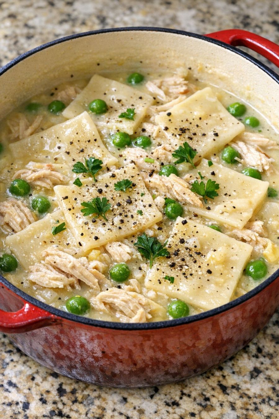 For extra richness, stir in 2–3 tablespoons of butter or a splash of half-and-half at the end of cooking. If you don’t have cooked chicken on hand, you can omit it for a meatless dumpling pot, or use canned chicken, leftover turkey, or even rotisserie chicken. A pinch of poultry seasoning, garlic powder, or onion powder added with the herbs will deepen the flavor without complicating the recipe. To stretch the meal, you can add a cup of frozen peas and carrots or corn during the last 5–7 minutes of simmering; just be sure the mixture returns to a gentle simmer so the vegetables heat through. If you prefer a thinner broth, add an extra cup of broth or water; for thicker, let it simmer uncovered a few extra minutes, stirring so it doesn’t stick. Food safety tips: Always keep frozen dumplings frozen until they go into the hot broth; do not let them sit at room temperature for long. If you’re using leftover cooked chicken, make sure it was cooled and stored properly in the refrigerator within 2 hours of cooking and used within 3–4 days. Reheat any leftovers to at least 165°F before serving, and refrigerate leftovers within 2 hours in shallow, covered containers. Discard any leftovers that have been left out at room temperature too long or kept more than 3–4 days in the refrigerator.