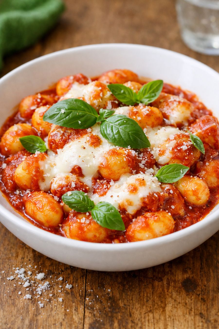 For picky eaters, you can use a very smooth marinara sauce and skip any chunky or spicy varieties. If your kids love cheese, swap in mild shredded cheddar or Colby-Jack for a more familiar flavor. To sneak in veggies, stir in a handful of baby spinach or frozen peas during the last few minutes of cooking; they’ll wilt or heat through quickly in the sauce. For a heartier dish, you can add cooked Italian sausage or rotisserie chicken (this would technically add more ingredients, so think of it as a bonus add-on for nights when you’re not strictly counting). If you prefer a creamier version, stir 1–2 tablespoons of cream cheese or a splash of heavy cream into the sauce along with the first portion of shredded cheese. For a lighter twist, use part-skim mozzarella and a lower-sodium marinara, and serve with a big salad. Food safety tips: Keep the gnocchi frozen until you’re ready to cook; do not let them sit at room temperature for long, as they can become sticky and clump. Heat the gnocchi and sauce until they are steaming hot throughout, and any added meats must be fully cooked and reheated to a safe temperature before serving. Refrigerate leftovers within 2 hours in a shallow container, and reheat on the stovetop over low heat or in the microwave until piping hot, adding a splash of water or extra sauce if needed to loosen.