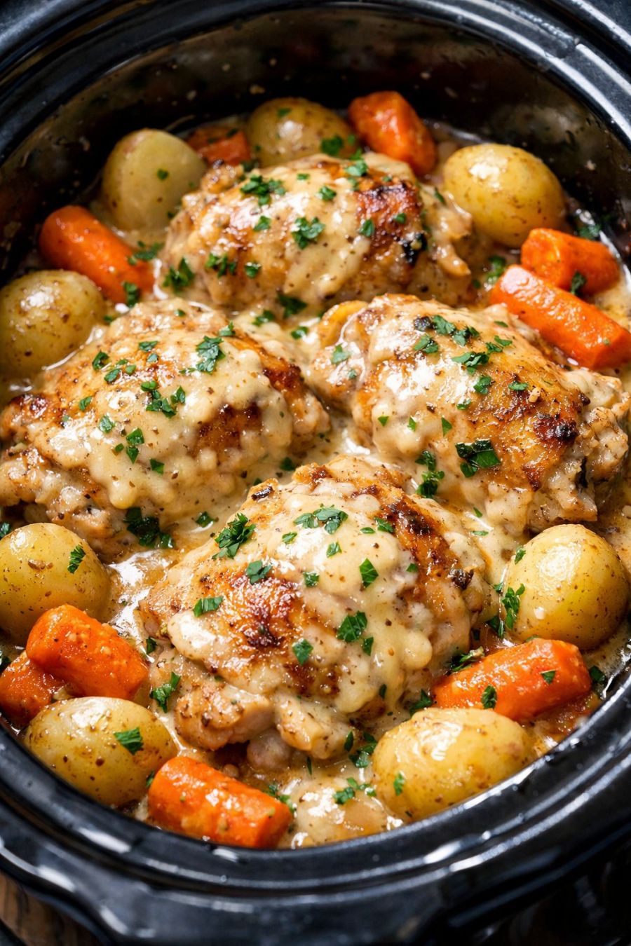 Cover the slow cooker with the lid and cook on LOW for 6 to 7 hours, or on HIGH for 3 1/2 to 4 hours, until the chicken thighs are very tender and reach at least 165°F in the thickest part.