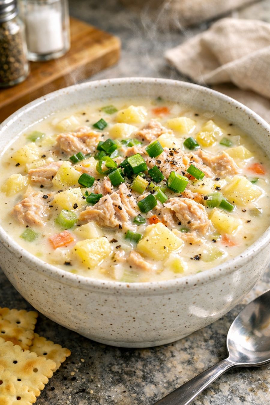 Serve this tuna chowder hot in deep bowls with plenty of crusty bread, buttered toast, or oyster crackers for texture. A simple green salad with a bright vinaigrette helps cut through the richness, and a side of steamed green beans or peas keeps the meal balanced. If you like a little heat, set out hot sauce, freshly ground black pepper, or red pepper flakes at the table. Leftovers reheat well for lunch the next day, and the chowder thickens slightly as it sits, making it especially good ladled over baked potatoes or rice.
