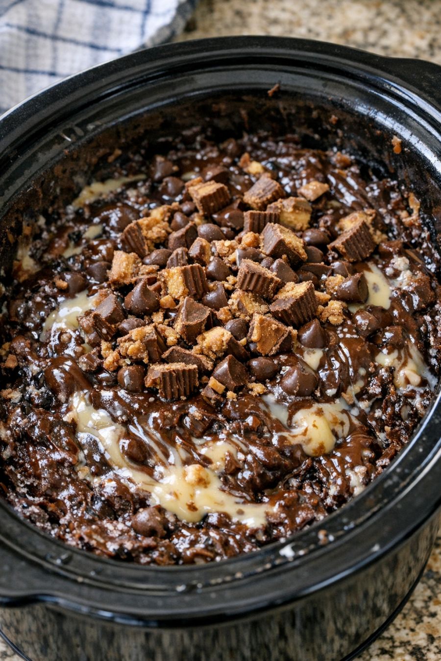 Cover the slow cooker with the lid and cook on LOW for 1½ to 2 hours. Do not stir during this time. The peanut butter cups will soften and melt into the chocolate mixture, forming a thick, spoonable dessert. The edges will look a bit set and fudgy, while the center stays soft and gooey.