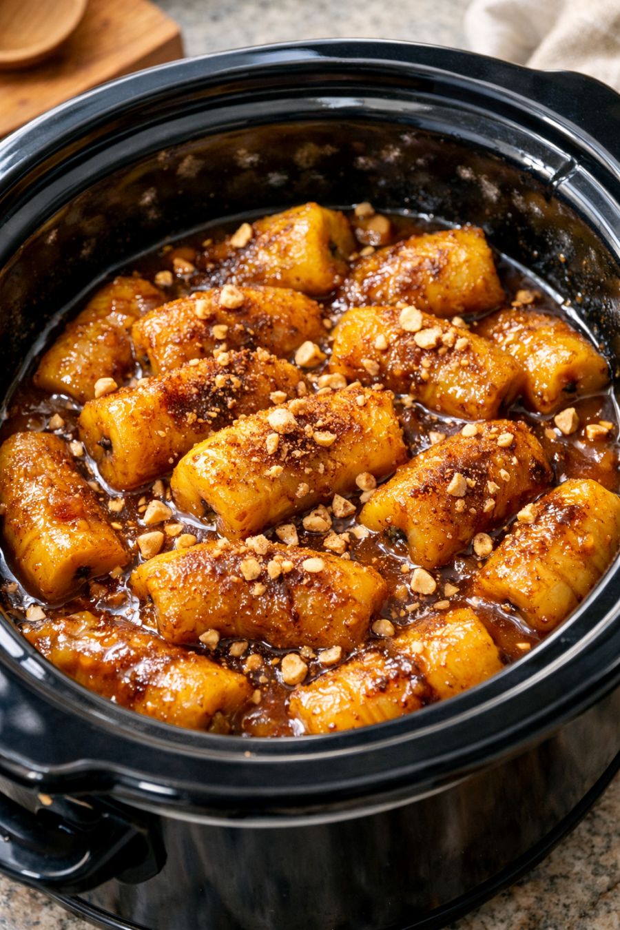 For a lighter dessert, swap full-fat coconut milk for light coconut milk; the sauce will be thinner but still flavorful. For extra warmth, add 1/4 teaspoon ground nutmeg or ginger along with the cinnamon, or drop in a whole cinnamon stick and remove it before serving. If you enjoy a bit of contrast, stir 1 teaspoon vanilla extract into the sauce after cooking, or sprinkle the finished plantains with toasted coconut flakes, chopped pecans, or peanuts for crunch. For an Earth Day-friendly twist, look for fair-trade sugar and honey or maple syrup, and consider using very ripe plantains that might otherwise be discarded; the more blackened the peel (while still firm inside), the sweeter the final dessert. To keep it vegan, use maple syrup instead of honey and serve with dairy-free yogurt or ice cream. Food safety tips: Always wash the unpeeled plantains before cooking to remove surface dirt and any residues, since the peels will be in direct contact with the cooking liquid. Use a sharp knife and cut away from your body when scoring the peels to avoid slipping on the curved surface. Because the slow cooker and caramel get very hot, use tongs and oven mitts when lifting the plantains from the pot, and allow them to cool slightly before handling or serving, especially to children. Refrigerate leftovers in a covered container within 2 hours of cooking and reheat gently in the microwave or on the stovetop until steaming hot.