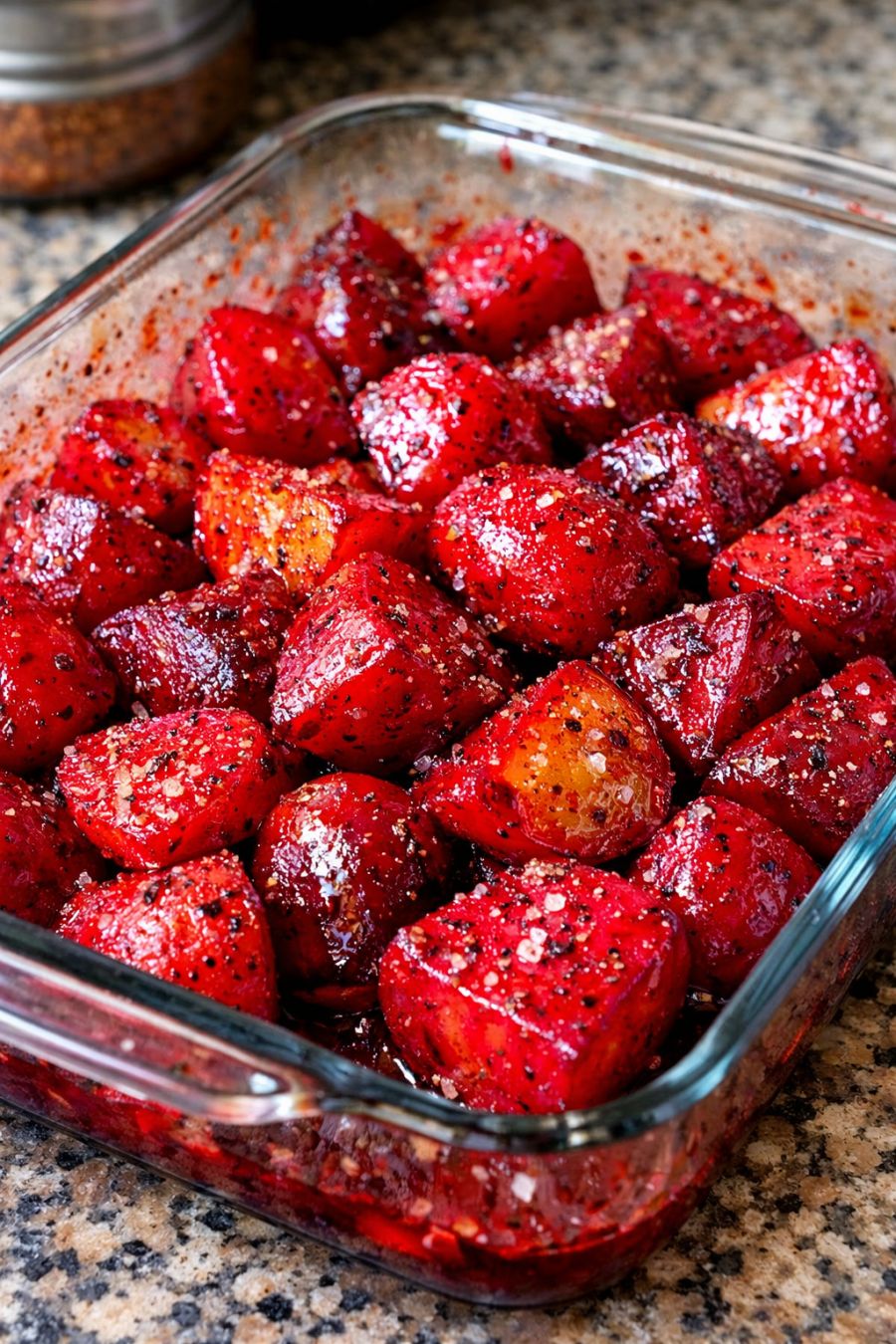 Let the potatoes rest for 5–10 minutes out of the oven so the juices settle slightly. Taste and adjust seasoning if needed, then serve warm straight from the glass pan, spooning some of the bright beet juices over each serving.