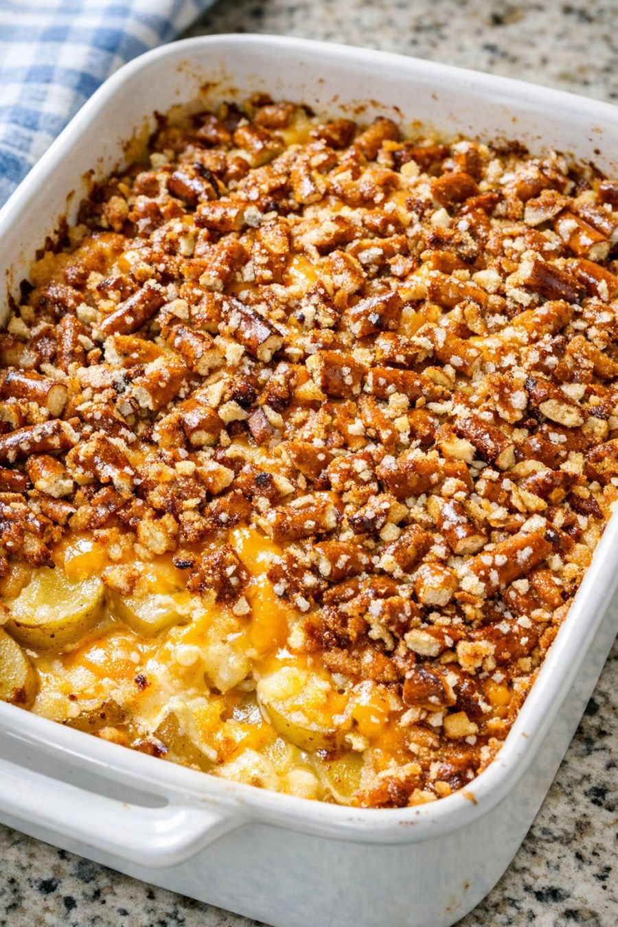 Let the casserole rest for 10 minutes before serving to allow the creamy base to thicken slightly and make cleaner scoops. Serve warm, making sure each portion includes some of the crunchy pretzel topping.