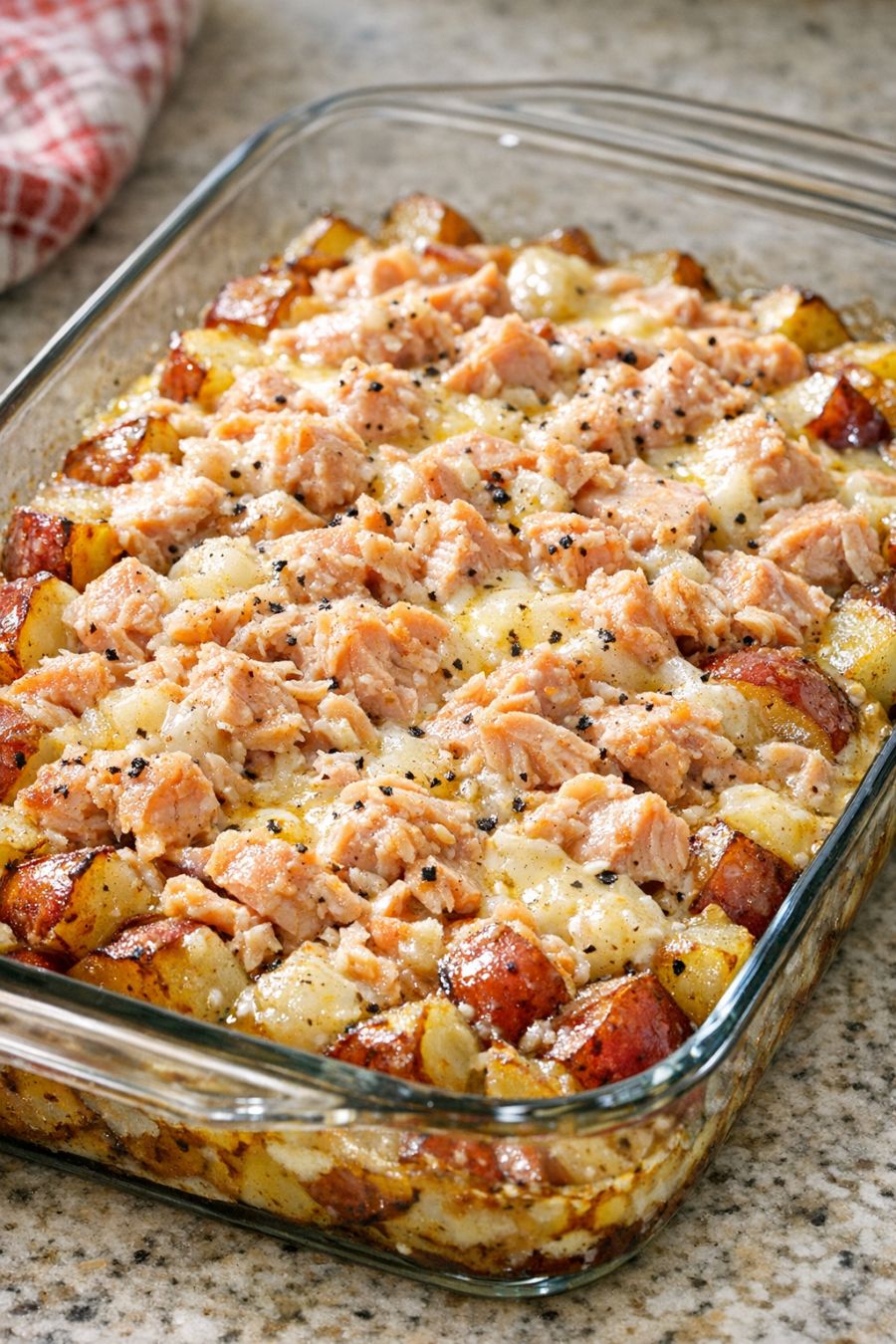Food safety tips: Always use canned salmon that is within its expiration date and whose cans are not bulging, rusted, or badly dented. Once opened, do not leave the salmon at room temperature for more than 2 hours; assemble the casserole and get it into the oven promptly. Bake until the center of the dish is piping hot and the potatoes are fully tender; while canned salmon is already cooked, the potatoes need sufficient time and temperature to be safe and palatable. Refrigerate leftovers within 2 hours of baking in a shallow container, and reheat thoroughly before eating, using within 3–4 days. Because this recipe uses a glass baking dish, avoid placing the hot dish directly on a very cold surface or under cold water to prevent thermal shock and potential breakage.