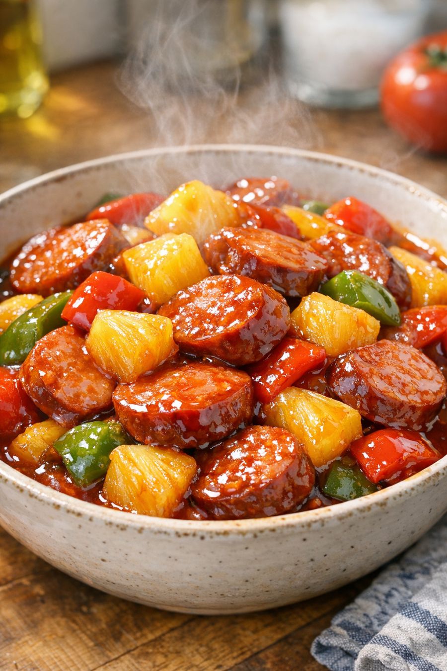 Serve the sweet and sour sausage straight from the slow cooker over steamed white rice or buttered egg noodles to soak up the sauce. For a lighter plate, spoon it into bowls with a side of simple sautéed green beans, roasted broccoli, or a crisp cabbage slaw to balance the sweetness. It also works well as a party dish: keep it on the warm setting and set out toothpicks so guests can spear pieces of sausage and pineapple as an appetizer. Leftovers make an easy lunch tucked into soft rolls or spooned over reheated rice.
