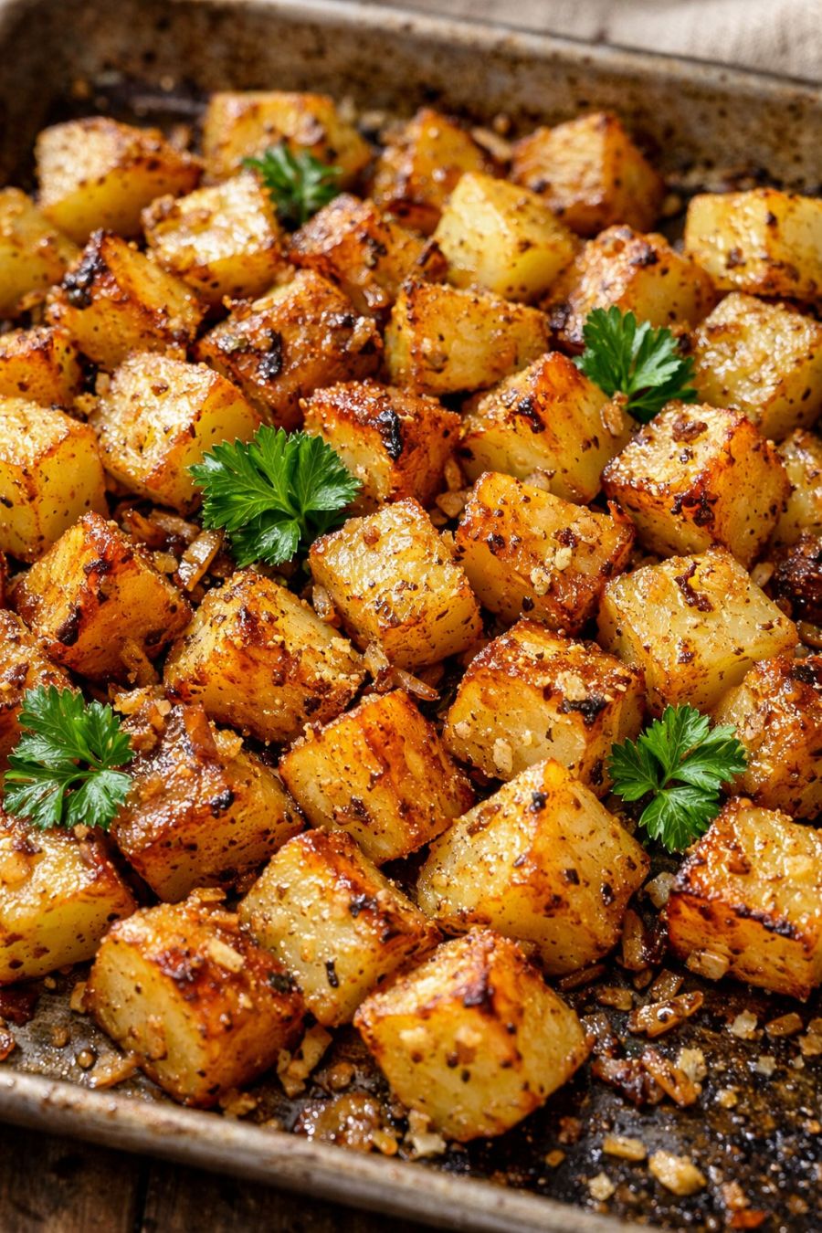 For a lighter version, you can swap the beef broth for vegetable broth or chicken broth, though beef broth gives the most classic French onion flavor. If you prefer a richer, slightly creamier finish, stir in 1–2 tablespoons of butter right after the potatoes come out of the oven so it melts into the pan juices. For extra color and freshness, sprinkle chopped fresh parsley or chives over the potatoes just before serving. You can also add 1 cup of sliced mushrooms or a handful of baby carrots to the pan along with the potatoes for a more complete one-pan side. If you need this to be vegetarian, choose a vegetarian onion soup mix and use vegetable broth. To make cleanup easier on busy nights, line your roasting pan with foil or parchment. Food safety tips: Always scrub potatoes well to remove dirt, and cut away any green spots or deep eyes before cooking. Use low-sodium broth if you’re watching your salt intake, since the onion soup mix is already seasoned. Refrigerate leftovers within 2 hours of cooking in a shallow container, and reheat thoroughly in the oven or microwave until piping hot before eating.