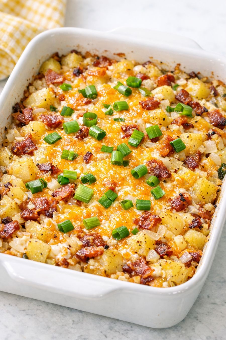 You can easily tweak this casserole to fit your family and pantry. For extra flavor and protein, stir in 1 to 2 cups of cooked, crumbled bacon, cooked breakfast sausage, diced ham, or leftover rotisserie chicken before baking. If you want to keep it vegetarian, use cream of mushroom or cream of celery soup instead of cream of chicken, and add a handful of diced bell peppers or a cup of frozen peas and carrots with the onions. For a little kick, add 1/2 teaspoon of smoked paprika, a pinch of red pepper flakes, or a few dashes of hot sauce into the sour cream and soup mixture. You can also swap part of the cheddar for Monterey Jack or pepper jack for a different flavor profile. If you’re trying to prep ahead, assemble the whole casserole (up through adding the first layer of cheese), cover tightly, and refrigerate for up to 24 hours; add 5 to 10 minutes to the covered baking time since it will be starting cold. For food safety, keep the casserole chilled at or below 40°F (4°C) if prepping in advance, and don’t leave the baked dish at room temperature for more than 2 hours. Leftovers should be cooled quickly, stored in an airtight container, and refrigerated within 2 hours; enjoy within 3 to 4 days, reheating until hot and steaming in the center. Always ensure the potatoes are cooked until fork-tender and the casserole is bubbling throughout before serving.