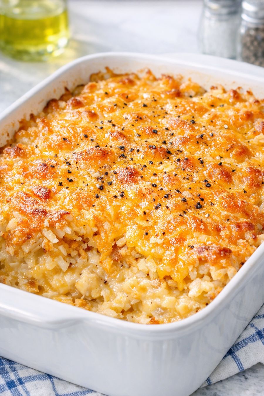 Remove the casserole from the oven and let it sit for about 5–10 minutes to set slightly. This makes it easier to scoop and helps the creamy layer thicken up.