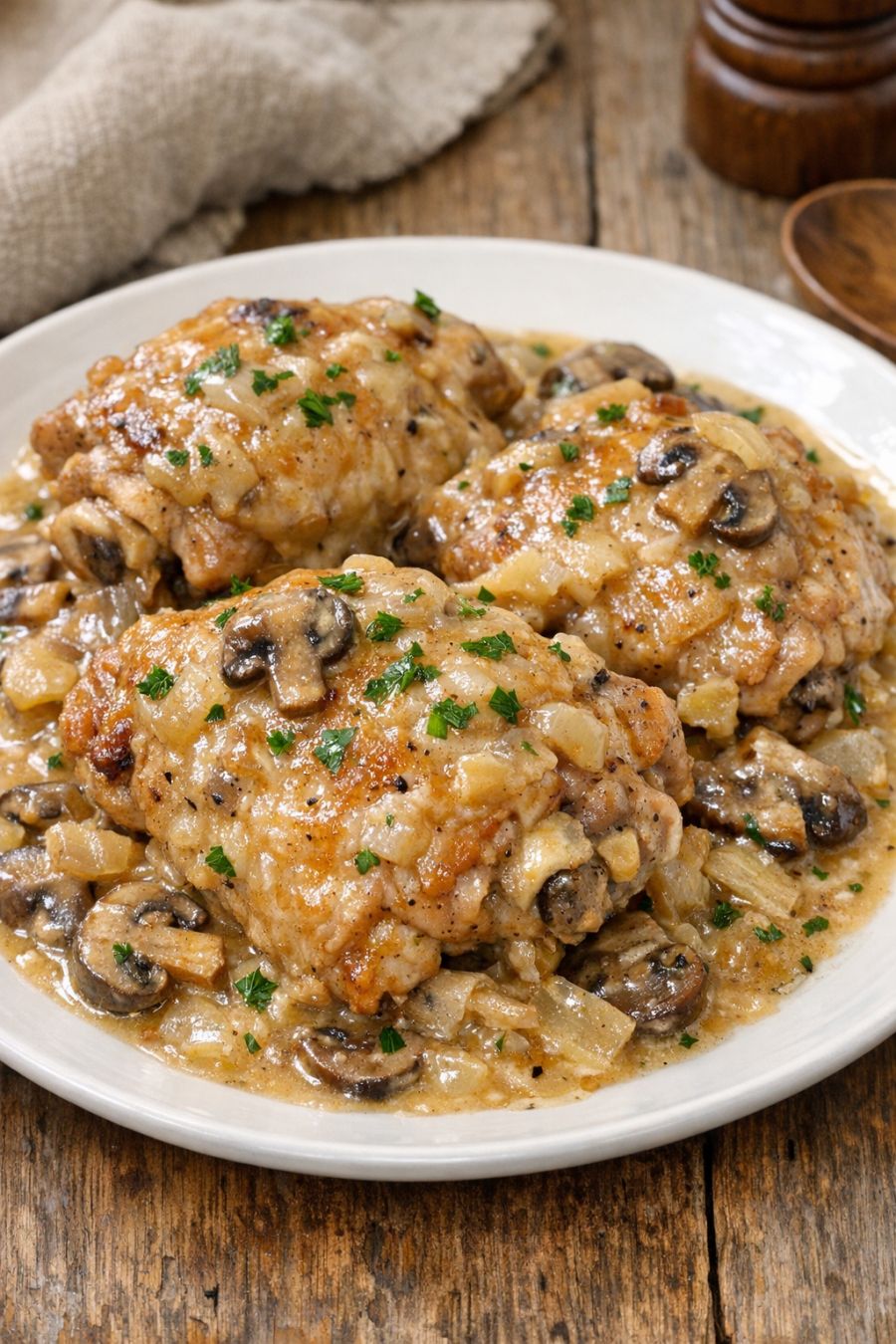 For picky eaters, you can swap the cream of mushroom soup for cream of chicken or cream of celery, which has a milder flavor. If your family doesn’t enjoy onion pieces, blend the soup and onion mix together with a splash of milk before pouring over the chicken to create a smoother sauce. For a slightly lighter version, remove the skin from the thighs before cooking; the sauce will be a bit less rich but still tasty. You can also add 1 to 2 cups of sliced mushrooms or baby carrots around the chicken before pouring on the sauce for built-in veggies. If you like a little tang, stir in 2 tablespoons of sour cream or plain Greek yogurt into the sauce at the very end (off the heat) for extra creaminess.