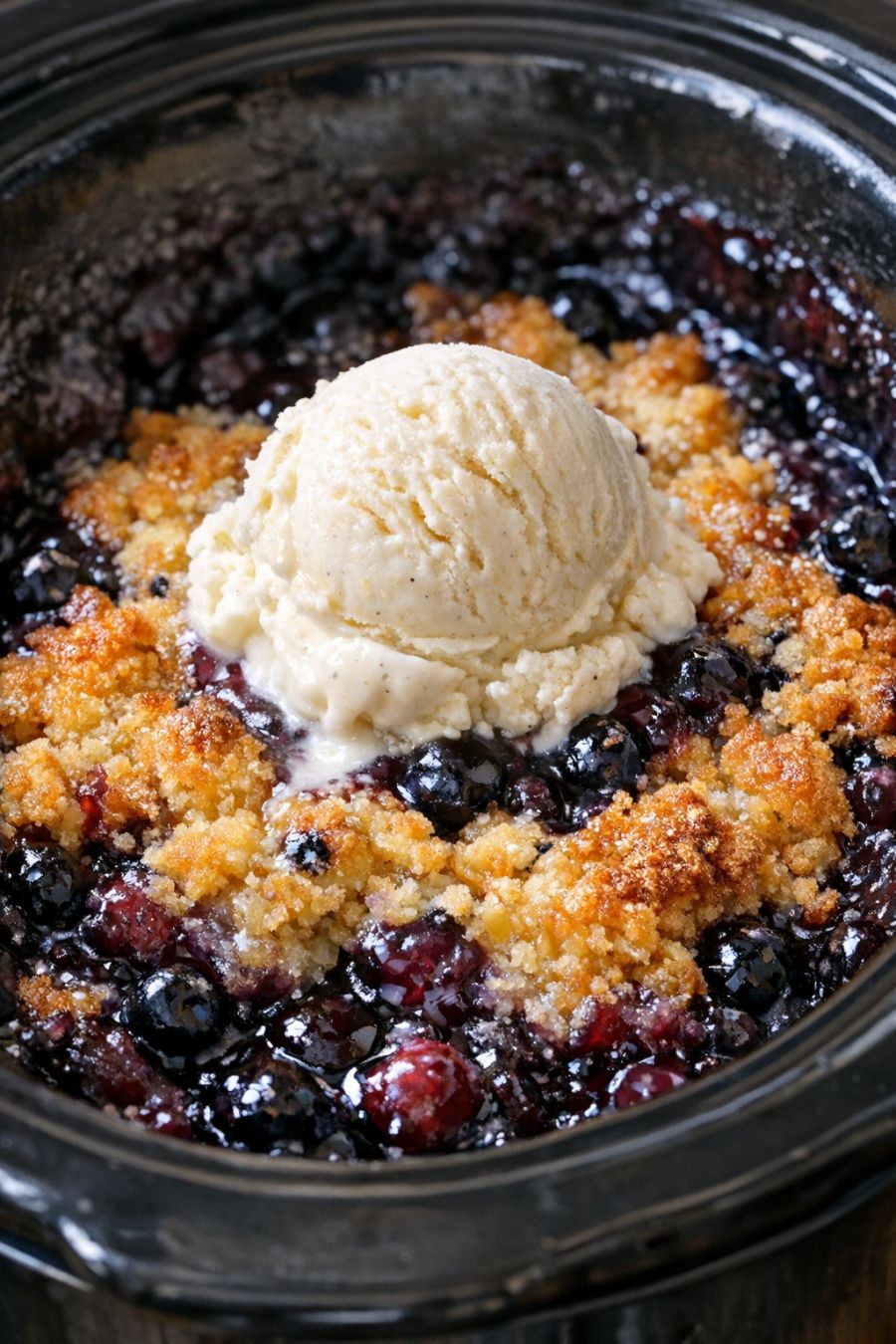 Spoon the warm blueberry dump cake into bowls and serve as-is or topped with ice cream or whipped cream. Keep the lid on the slow cooker when not serving to hold in moisture and warmth.
